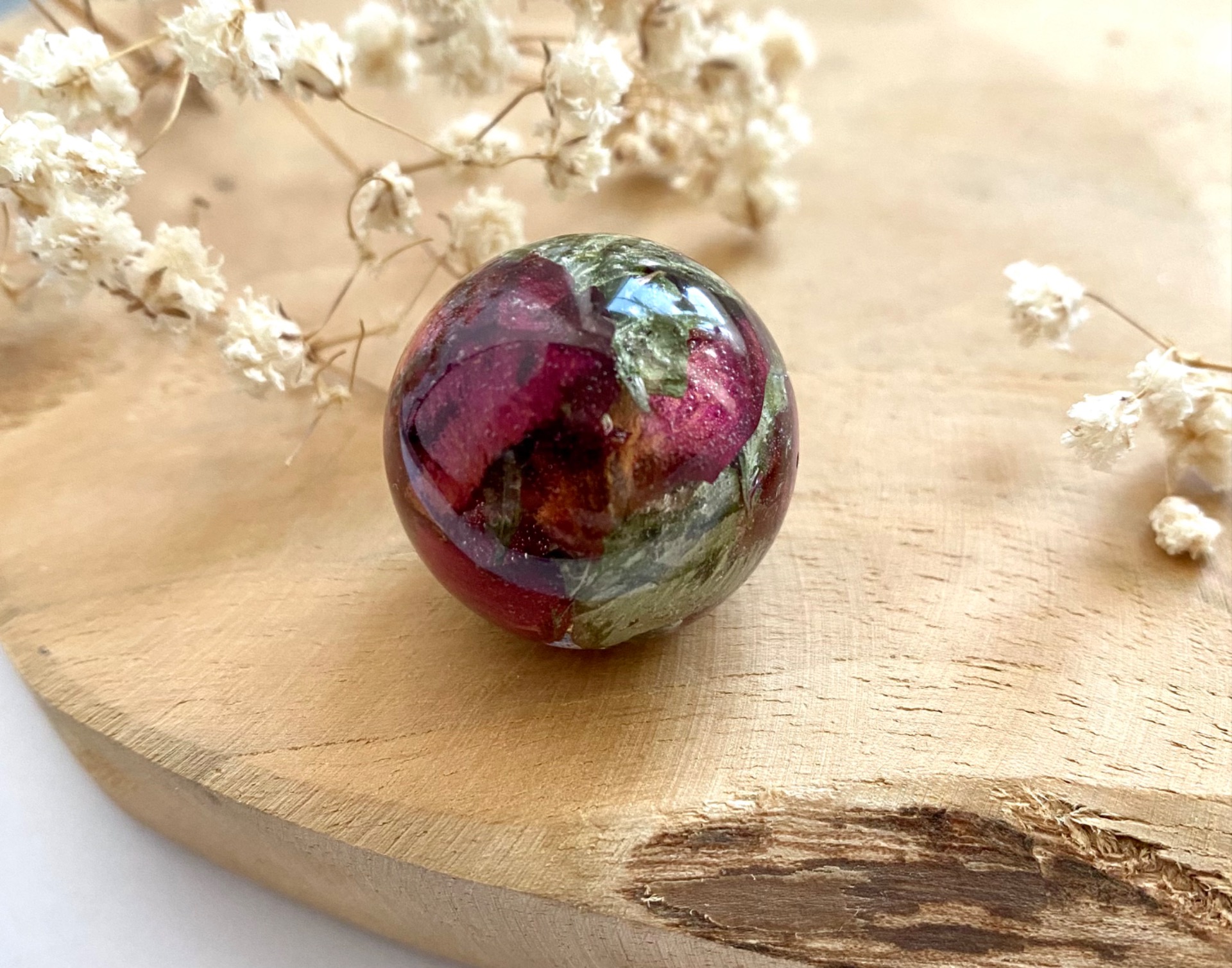 Přívěsek koule s pravými sušenými květy červené Růže.Velikost: 2,3 cm. Háček: Chirurgická ocel.