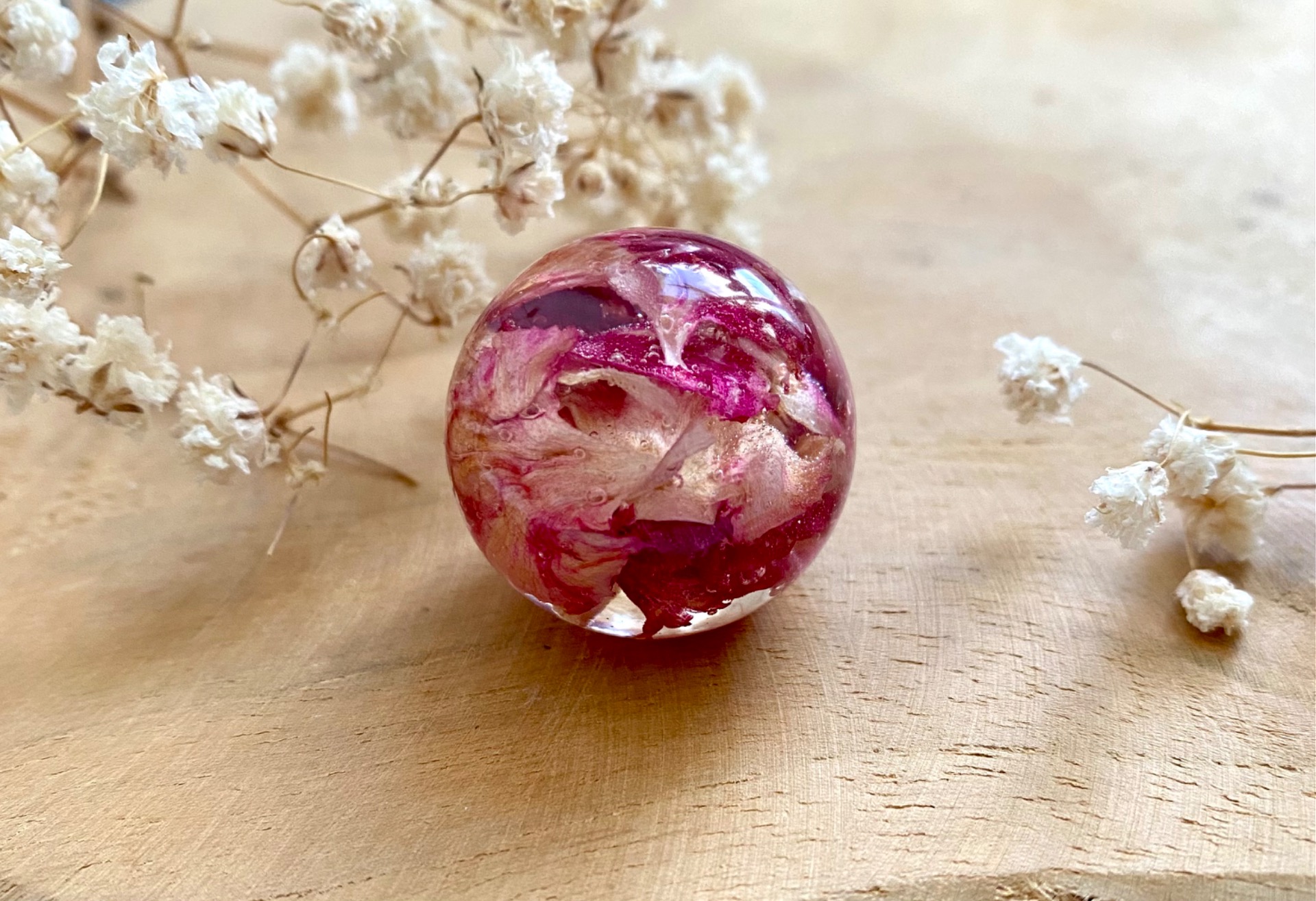 Přívěsek koule s pravými sušenými květy Karafiátu.Velikost: 2,3 cm. Háček: Chirurgická ocel.