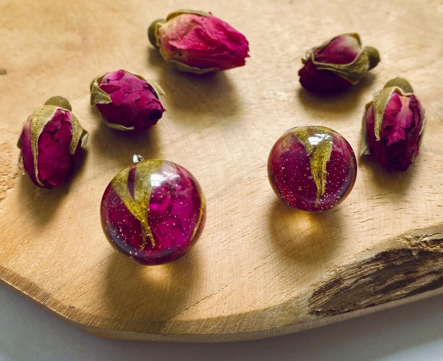 Přívěsek koule (vlevo) s pravým sušeným květem - poupě Růže.Velikost: 1,8 cmKroužek: Chirurgická ocel.