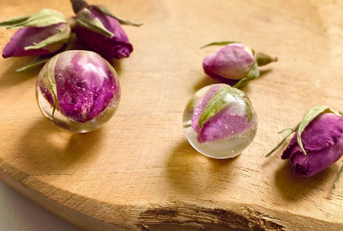 Přívěsek koule (vlevo) s pravým sušeným květem - poupě Růže.