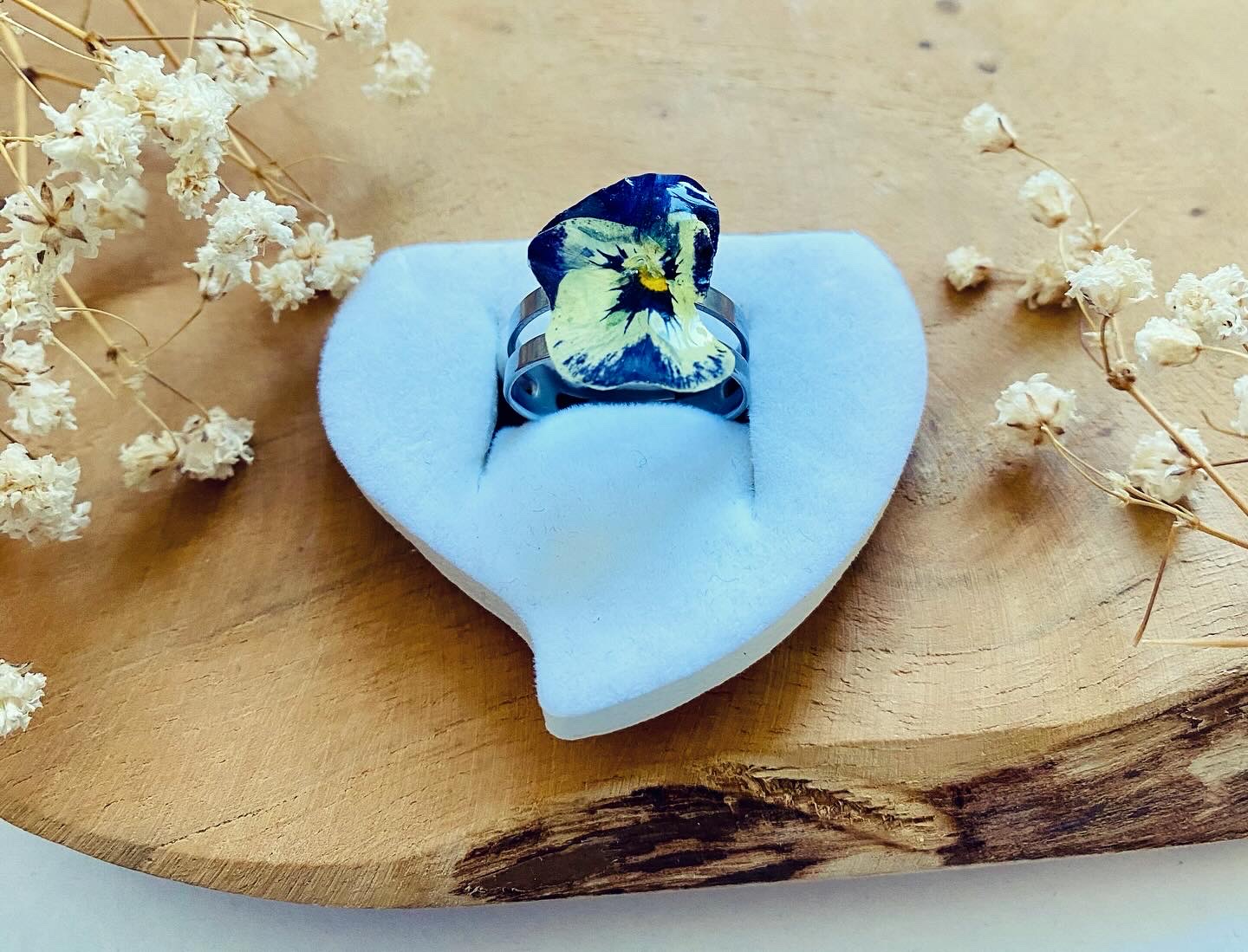 Prstýnek z chirurgické oceli s pravým sušeným květem Macešky.Velikost Macešky: 2 cm.Velikost Prstýnku: Univerzální (nastavitelný).