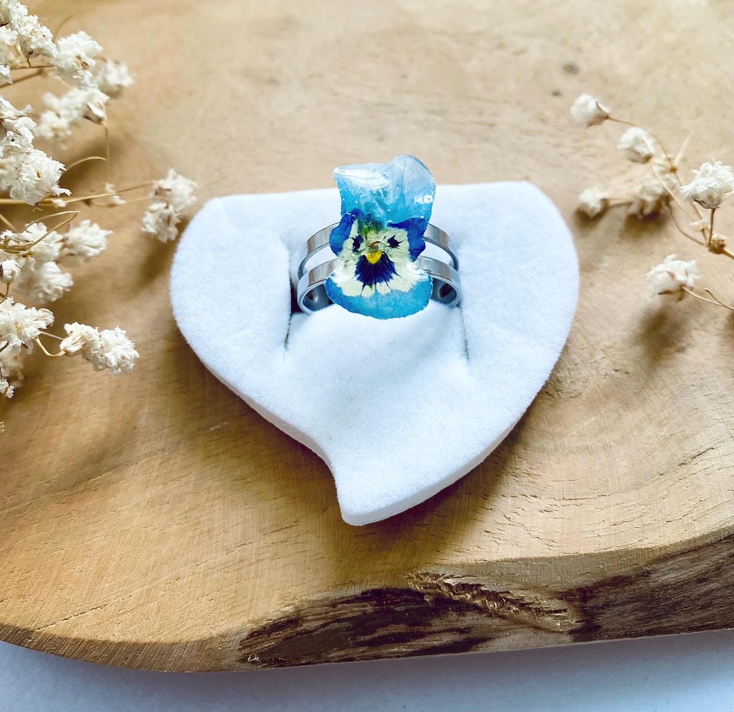 Prstýnek z chirurgické oceli s pravým sušeným květem Macešky.Velikost macešky: 2 cm.Velikost Prstýnku: Univerzální (nastavitelný).