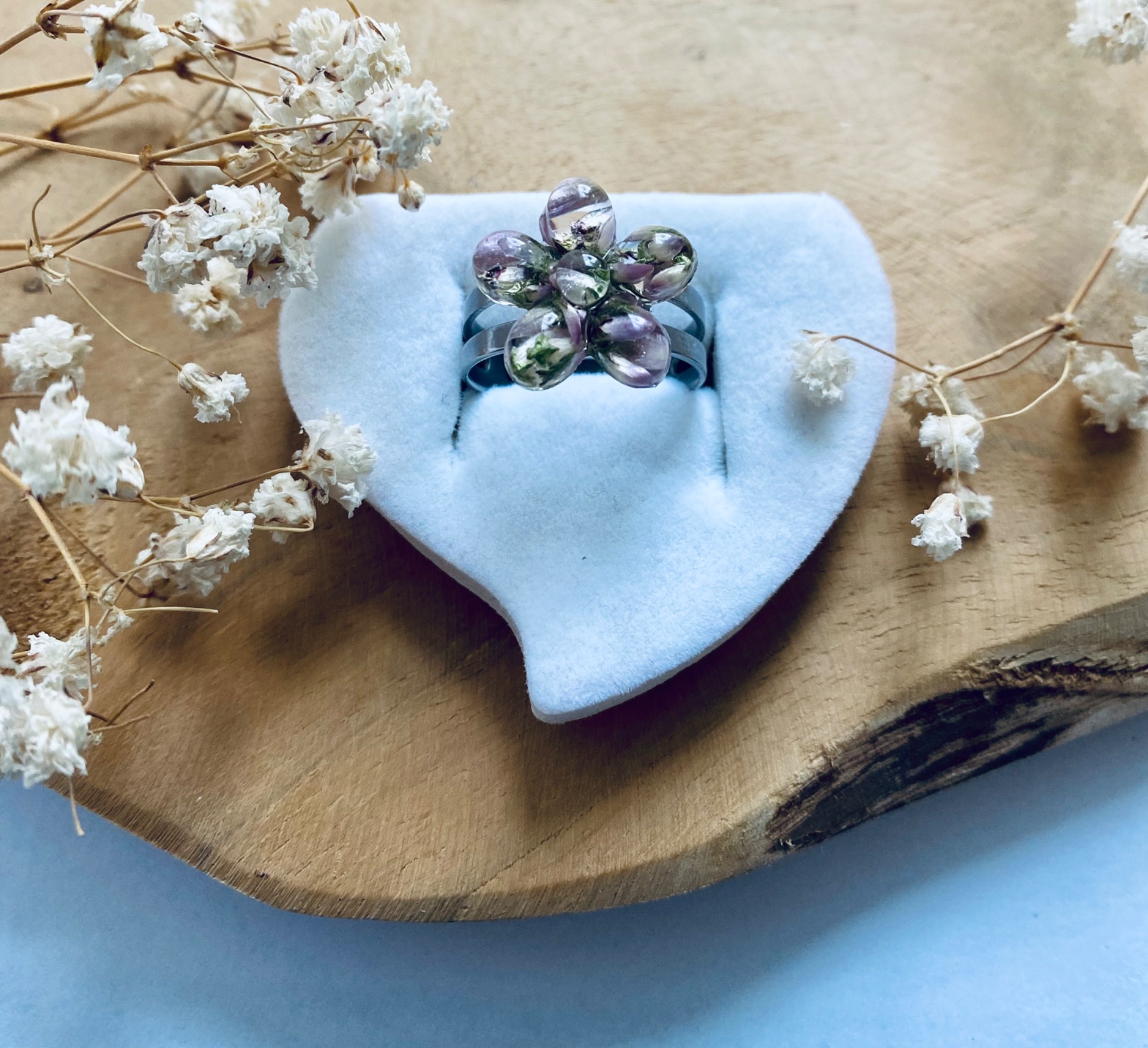 Prstýnek z chirurgické oceli s pravými sušenými květy fialového Vřesu.Velikost kytičky: 1,8 cm.Velikost Prstýnku: Univerzální (nastavitelný).