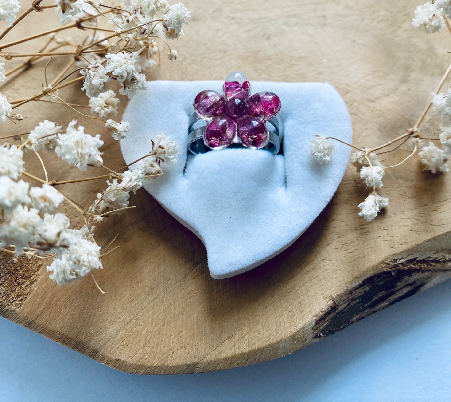 Prstýnek z chirurgické oceli s pravými sušenými květy Vřesu Erica.Velikost kytičky: 1,8 cm.Velikost Prstýnku: Univerzální (nastavitelný).