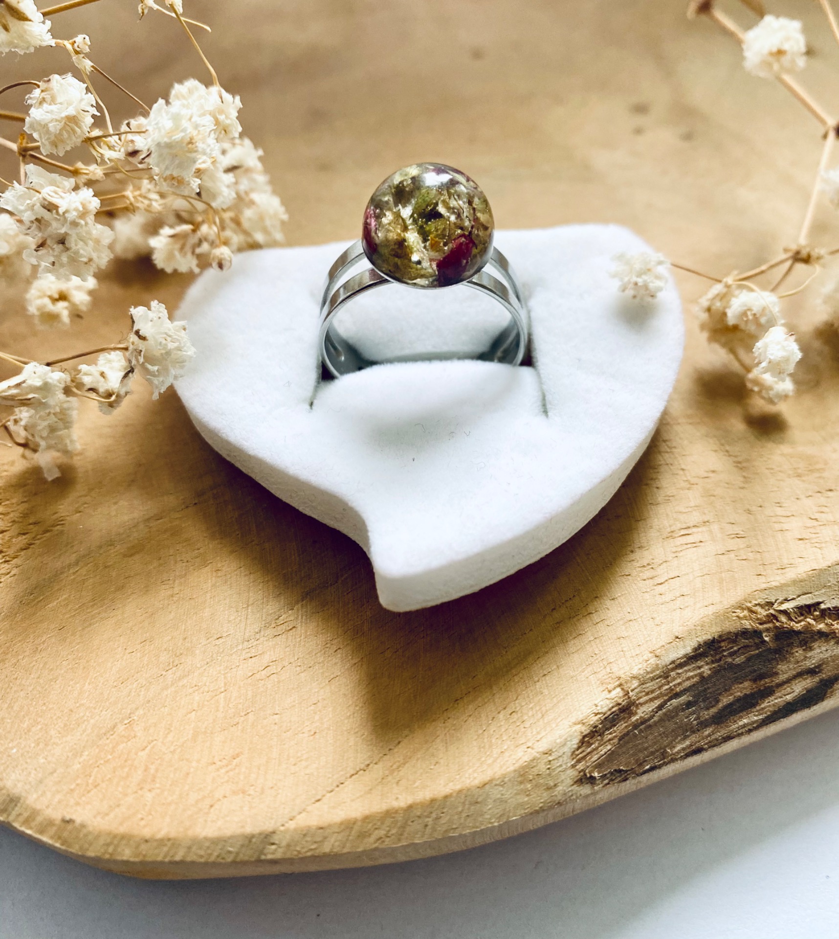 Prstýnek z chirurgické oceli s pravými sušenými květy zeleného Mechu a Vřesu Erica.Velikost půlkuličky: 1,2 cm.Velikost Prstýnku: Univerzální (nastavitelný).