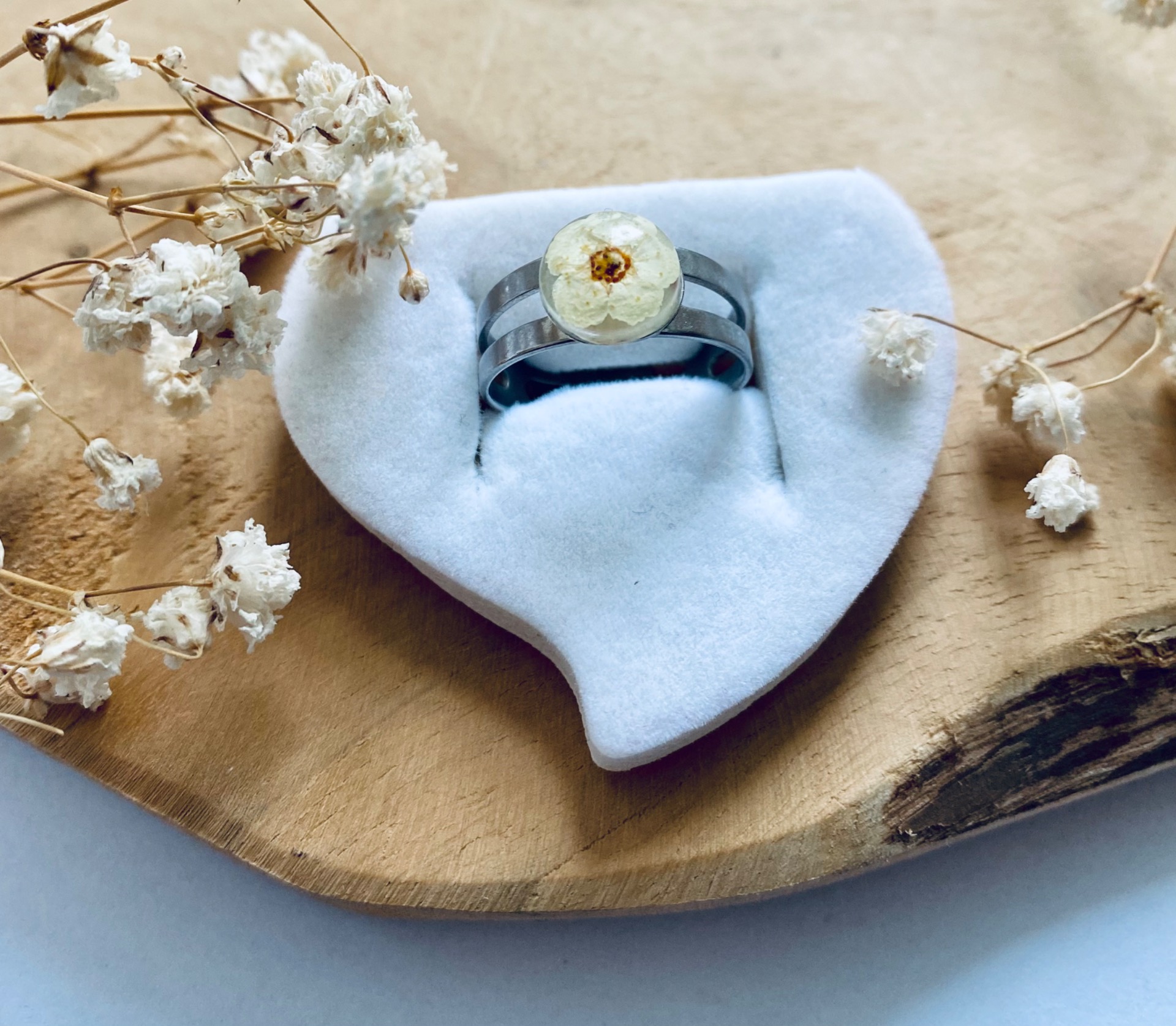 Prstýnek z chirurgické oceli s pravým sušeným květem Tavolníku.