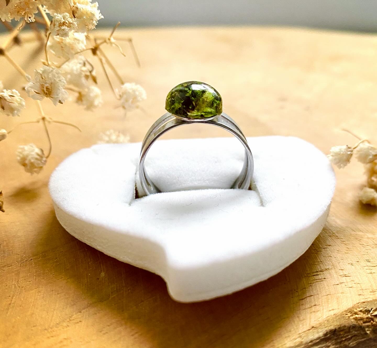 Prstýnek z chirurgické oceli s pravým sušeným Mechem.Velikost půlkuličky: 1 cm.Velikost Prstýnku: Univerzální (nastavitelný).