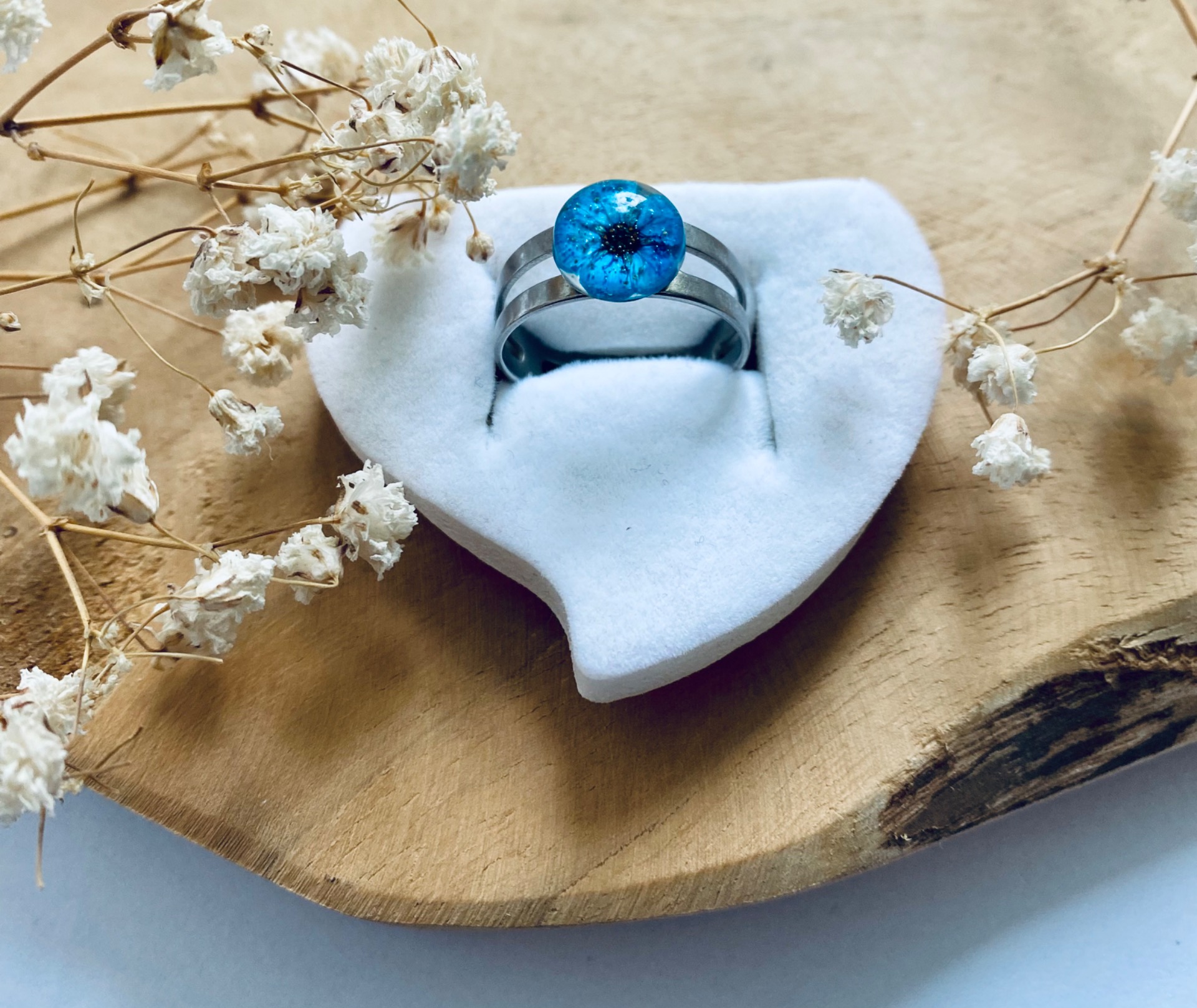 Prstýnek z chirurgické oceli s pravým sušeným květem Tavolníku.