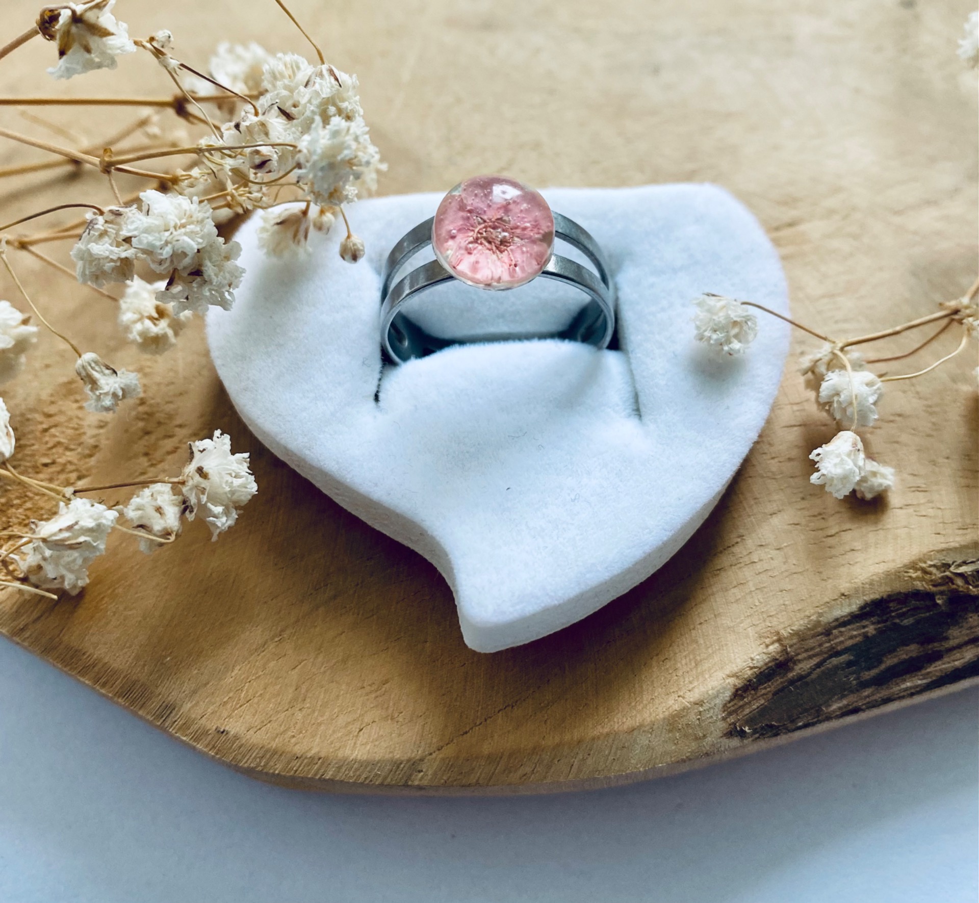 Prstýnek z chirurgické oceli s pravým sušeným květem Tavolníku.