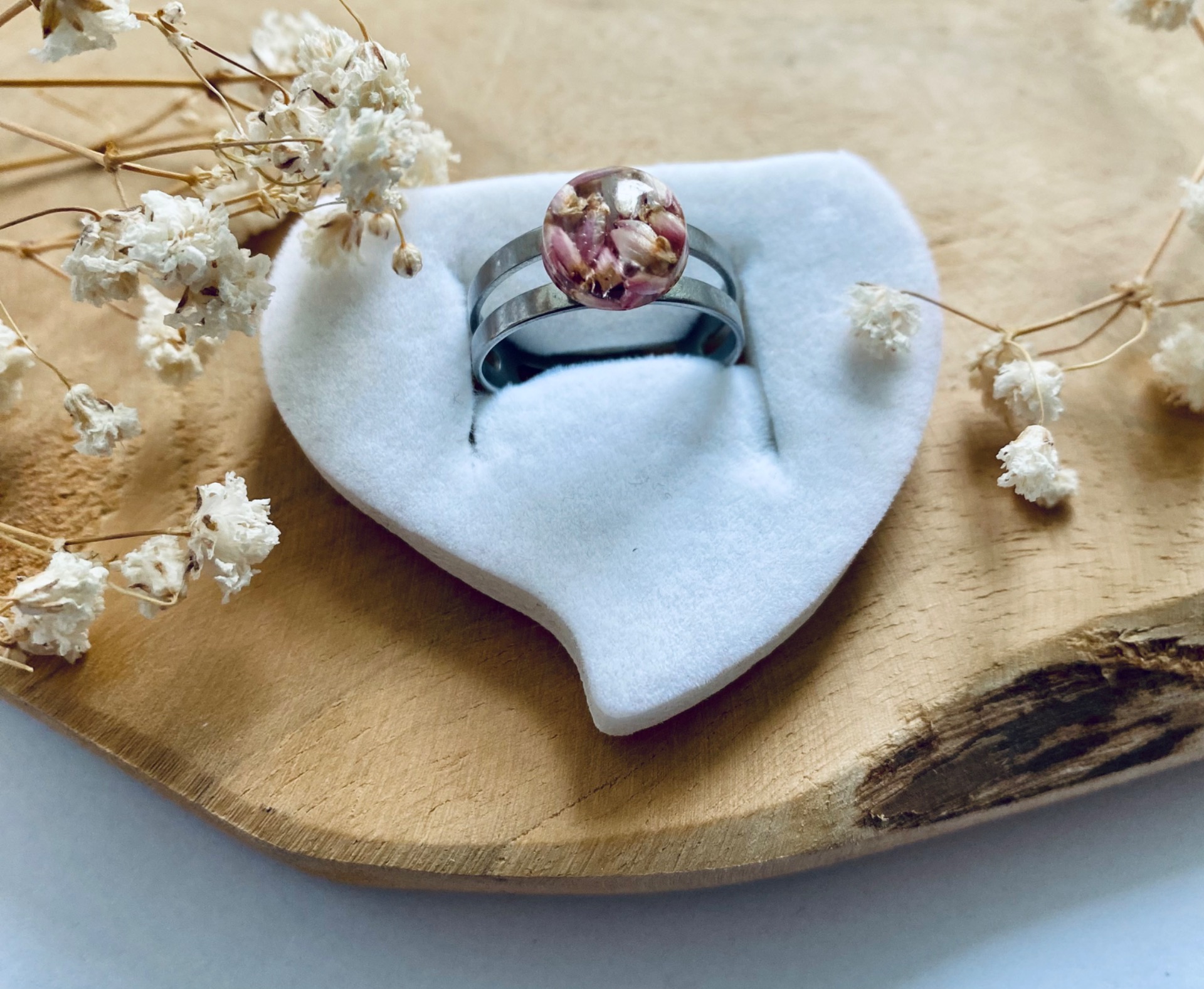 Prstýnek z chirurgické oceli s pravými sušenými květy fialového Vřesu.Velikost půlkuličky: 1 cm.Velikost Prstýnku: Univerzální (nastavitelný).