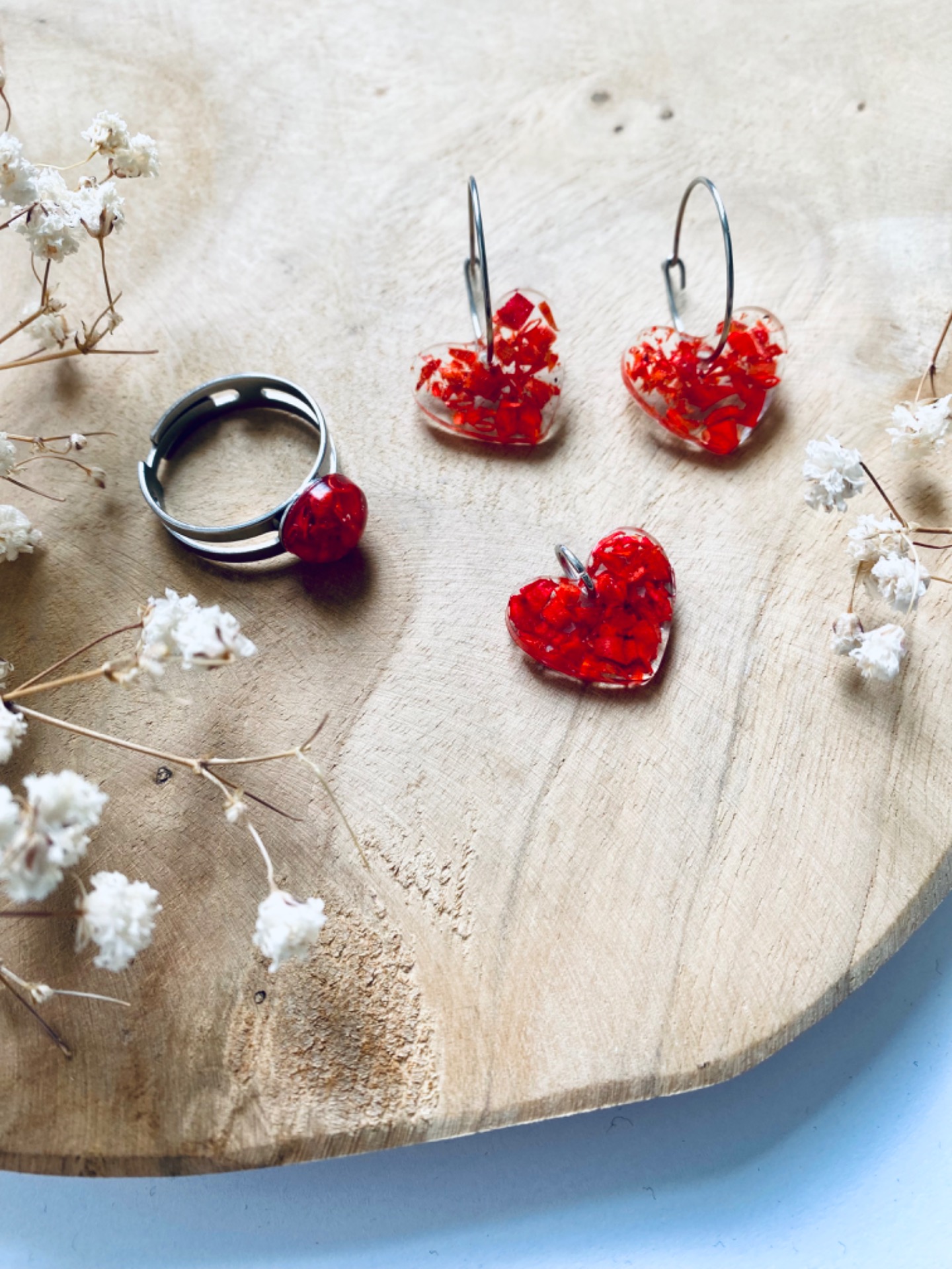 Set s pravými sušenými květy červené Růže.Set obsahuje:visací náušnice přívěsek prstýnek