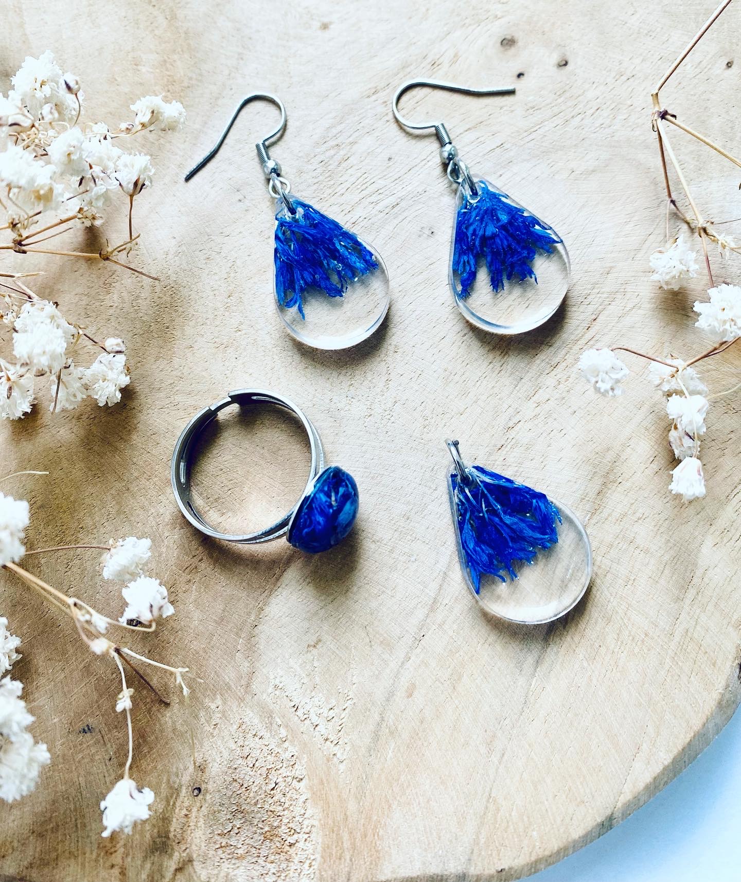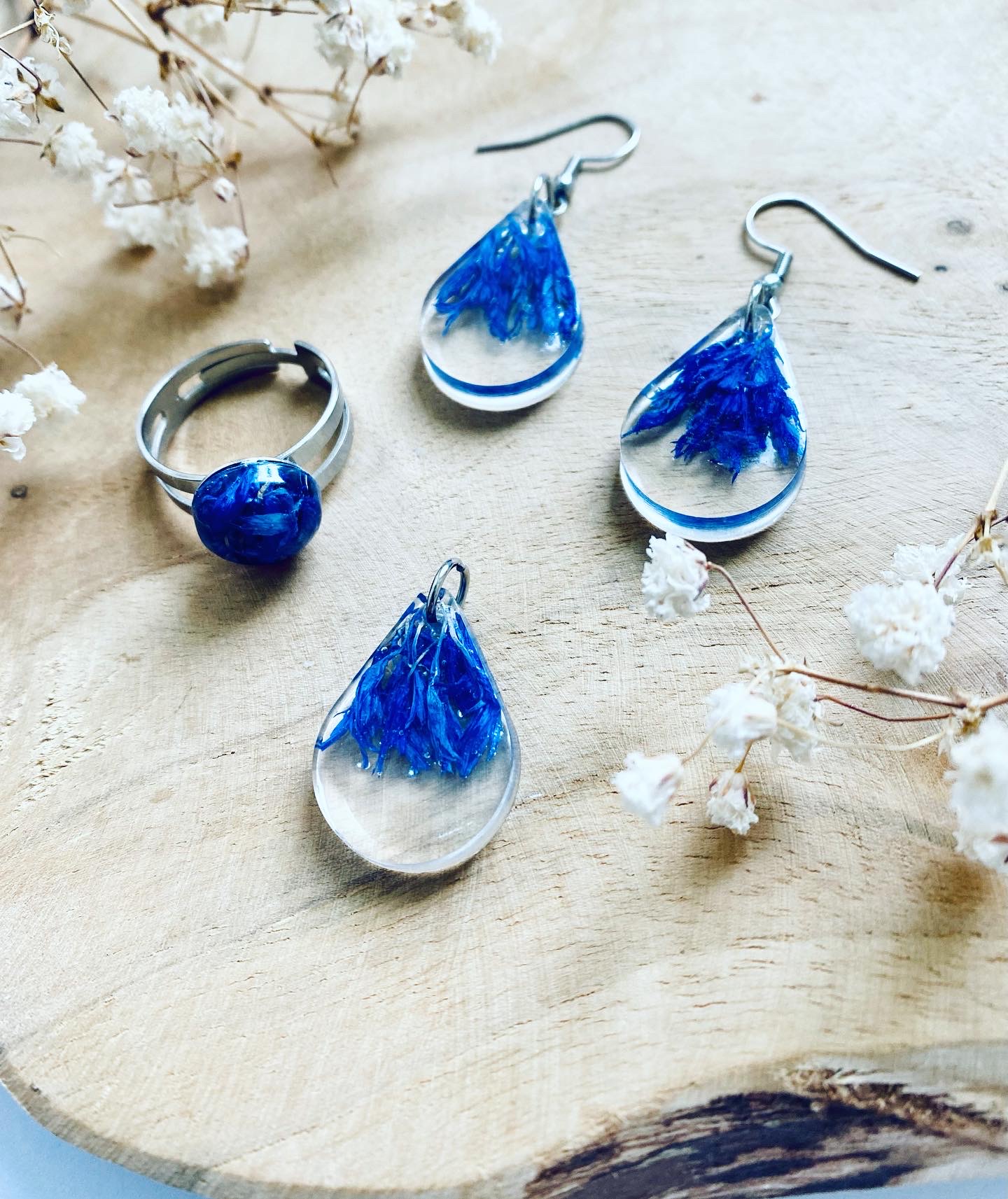 Set s pravými sušenými květy Chrpy.Set obsahuje:visací náušnice přívěsek prstýnek