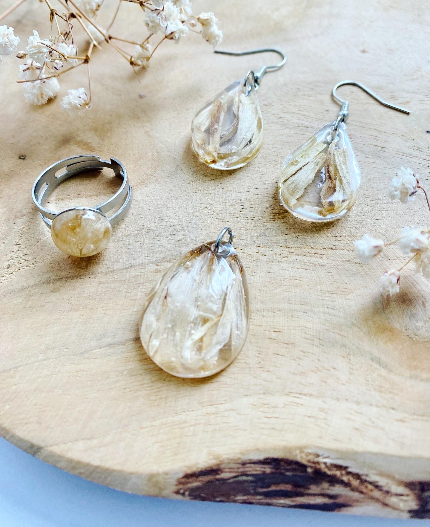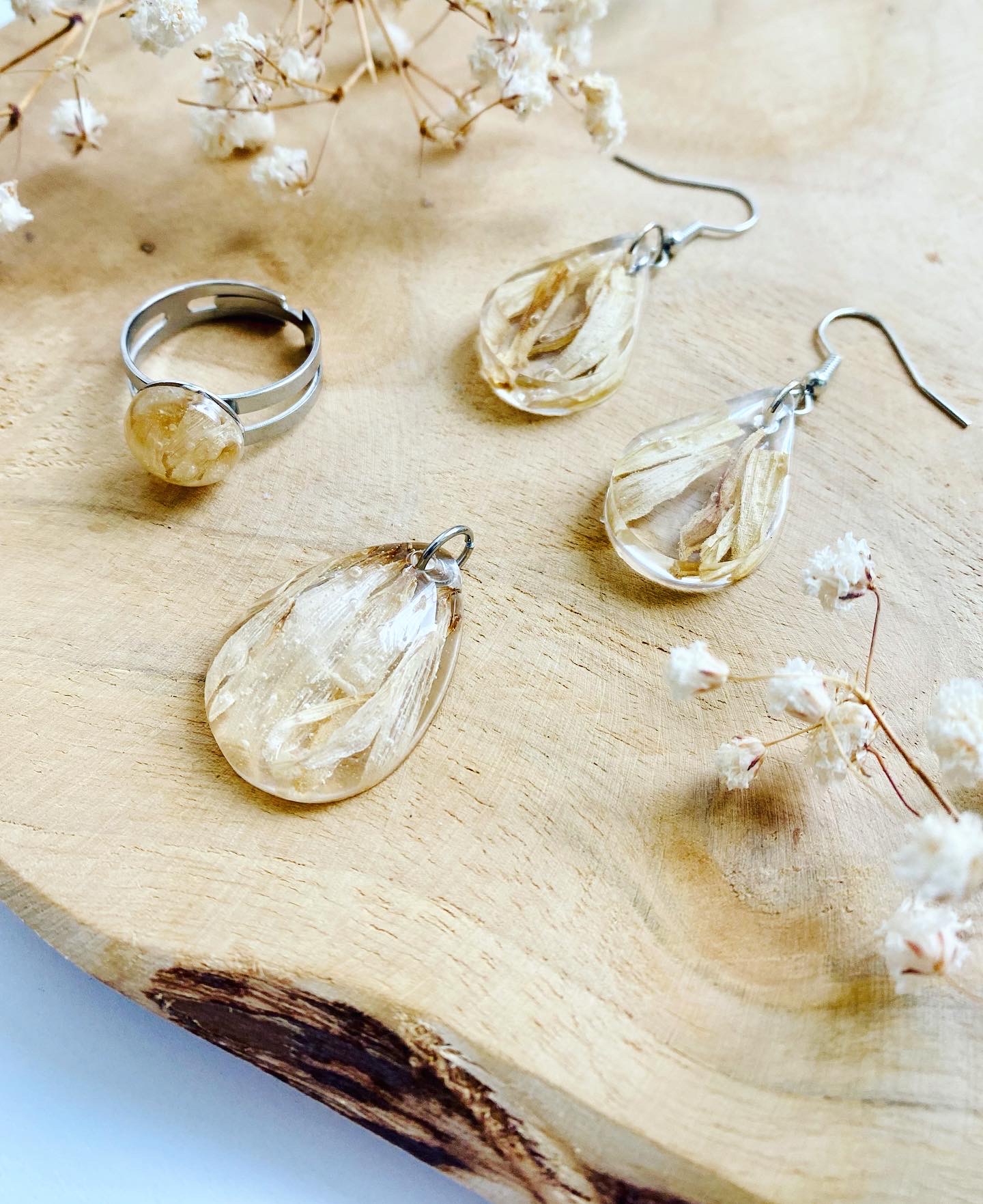 Set s pravými sušenými květy Gerbery.Set obsahuje:visací náušnice přívěsek prstýnek