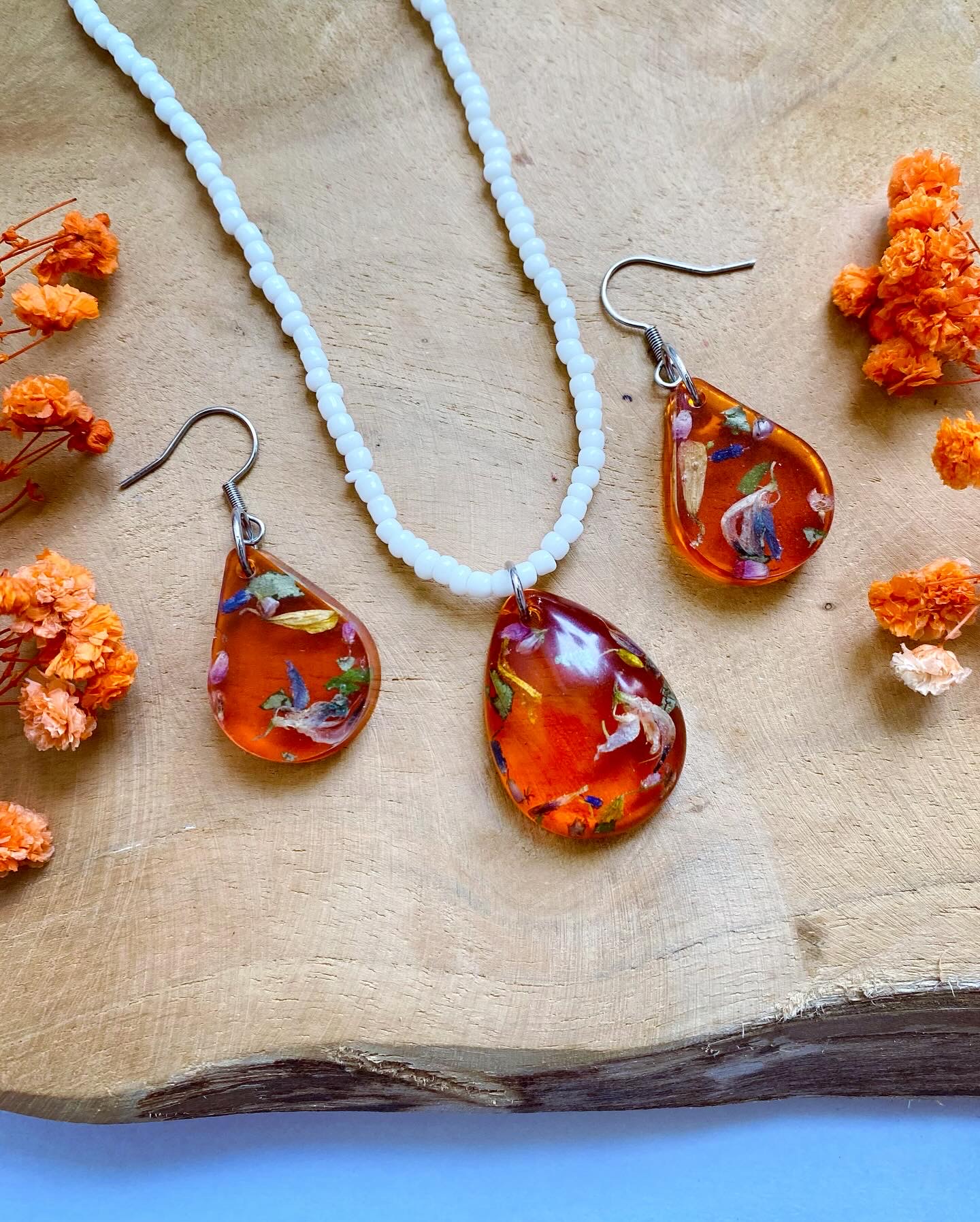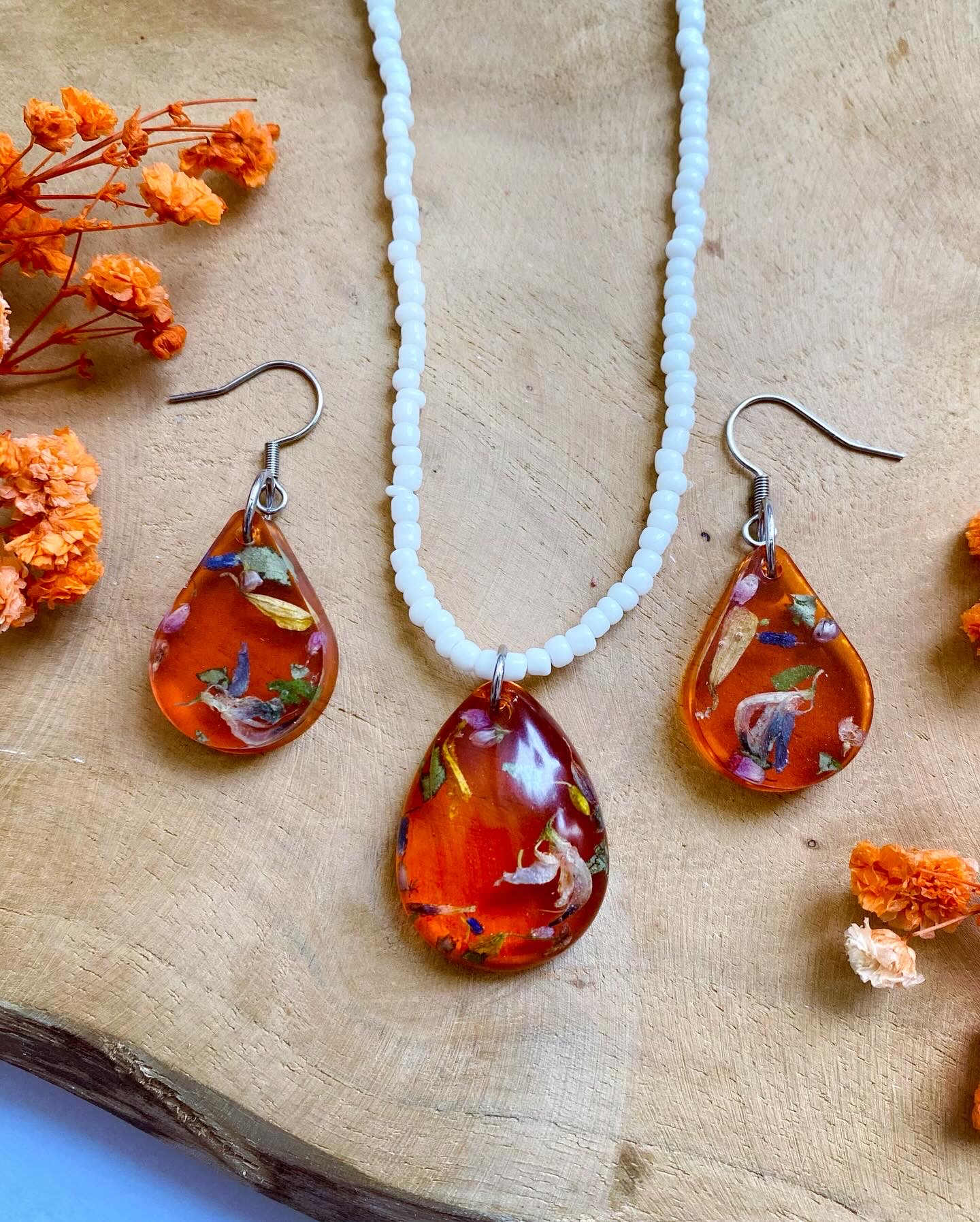 Set s pravými sušenými květy Lučního kvítí podbarvené oranžovou barvou .Set obsahuje:visací náušnicepřívěsek❣️(bez řetízku)❣️