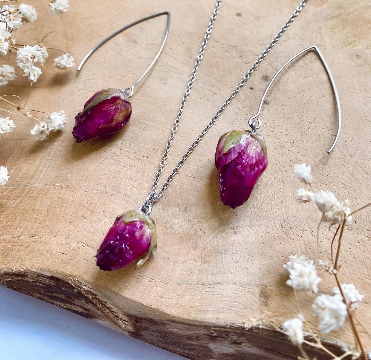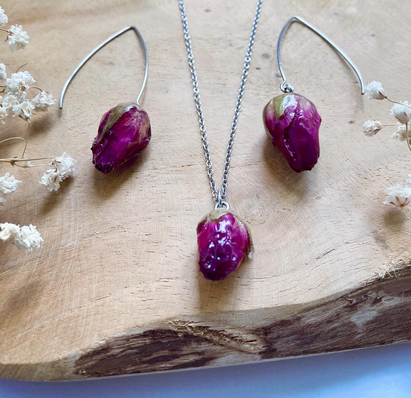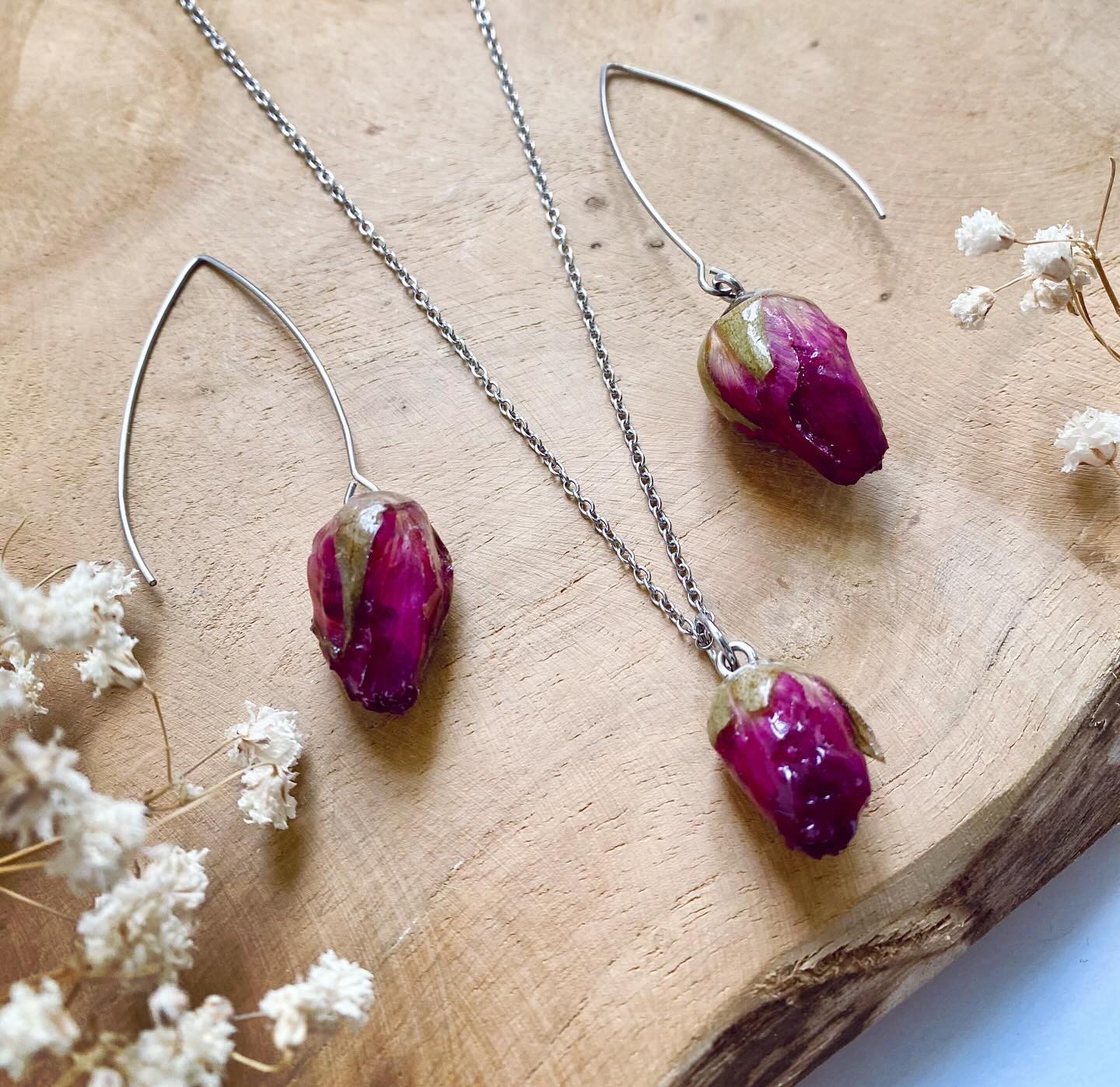 Set s pravými sušenými poupaty červené Růže.Velikost poupat: cca 2 cm.Komponenty: chirurgická ocel.Set neobsahuje řetízek.