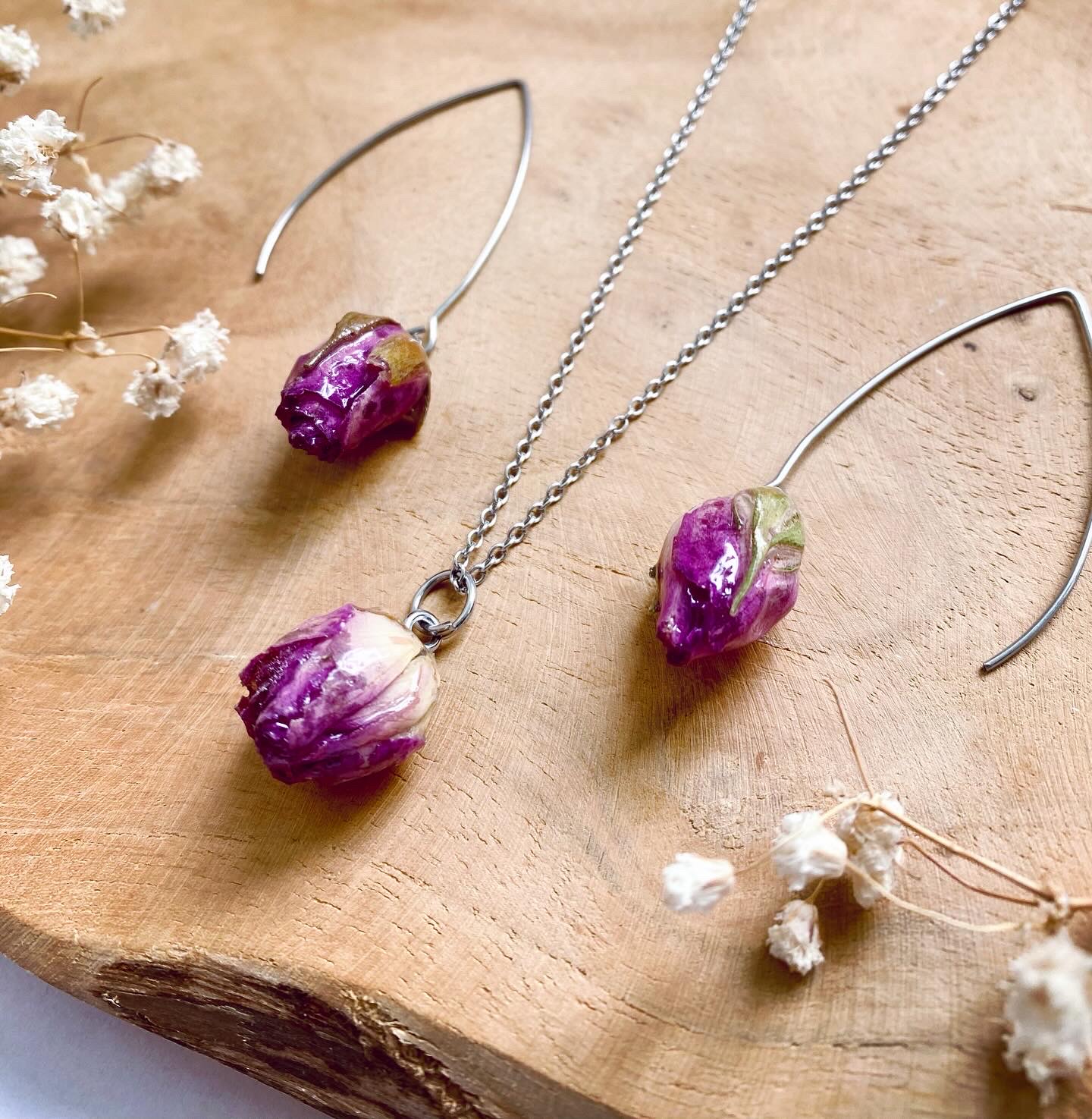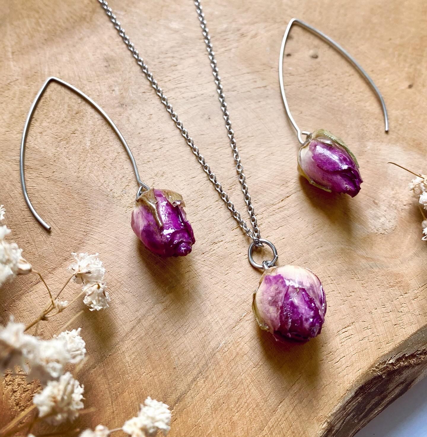 Set s pravými sušenými poupaty růžové Růže.Velikost poupat: cca 2 cm.Komponenty: chirurgická ocel.Set neobsahuje řetízek.