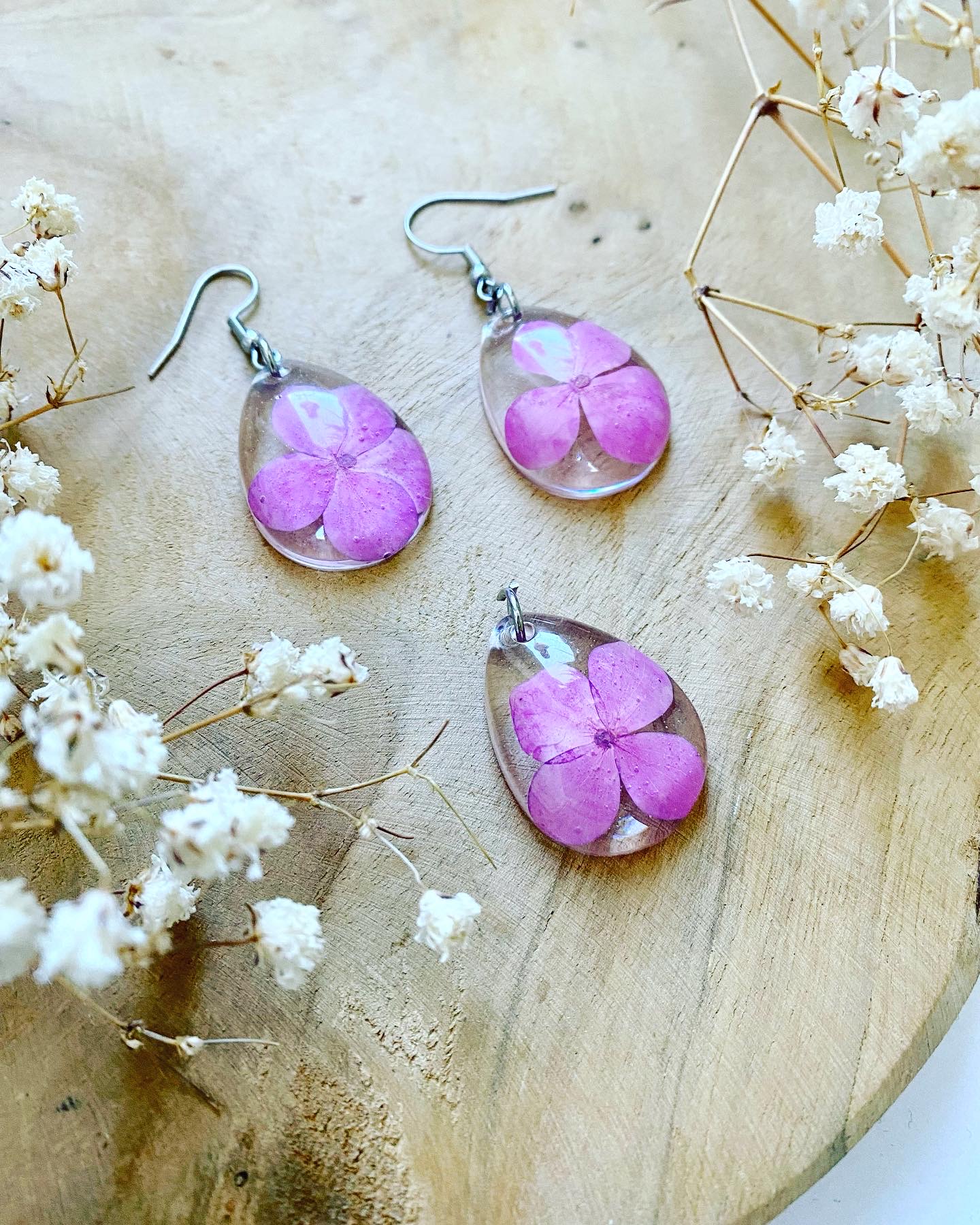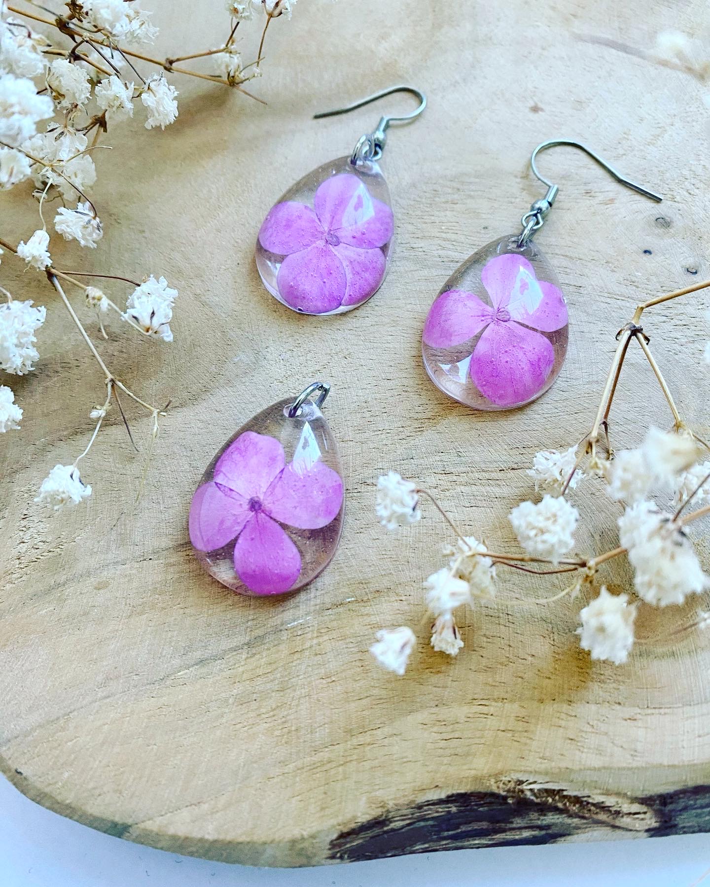 Set s pravými sušenými květy růžové Hortenzie.Set obsahuje:visací náušnice přívěsek