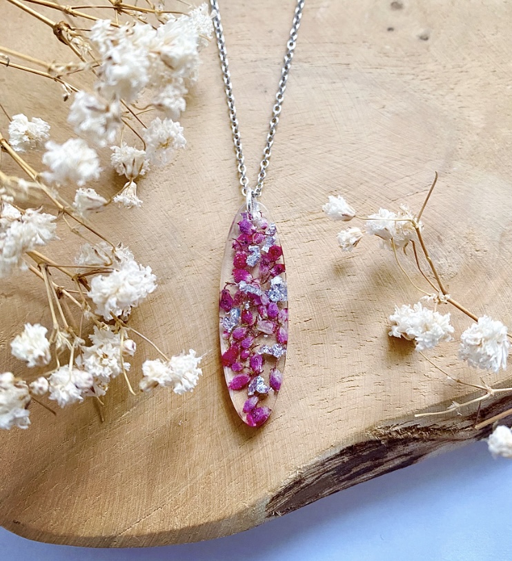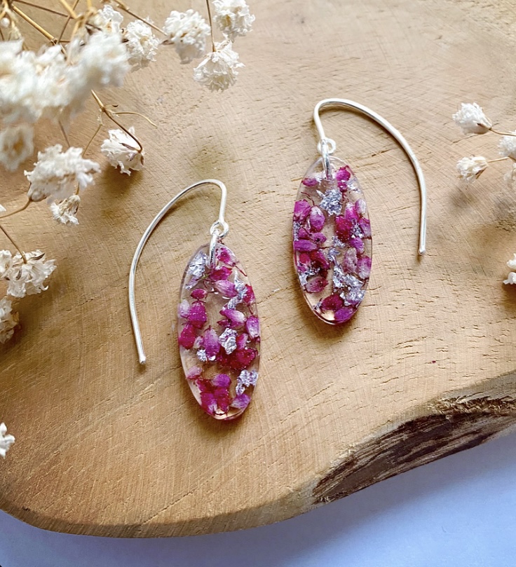 Set s pravými sušenými květy Vřesu Erica a stříbrnými plátky.Komponenty: háčky a kroužky - stříbrné Ag925.