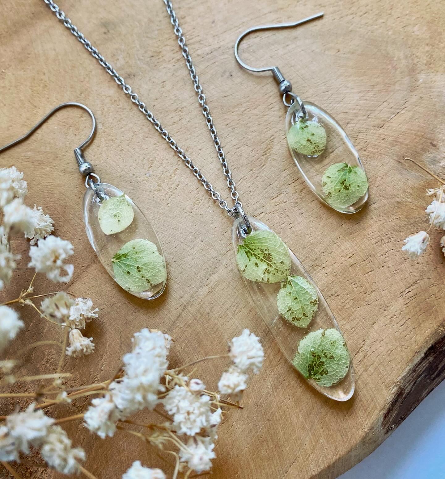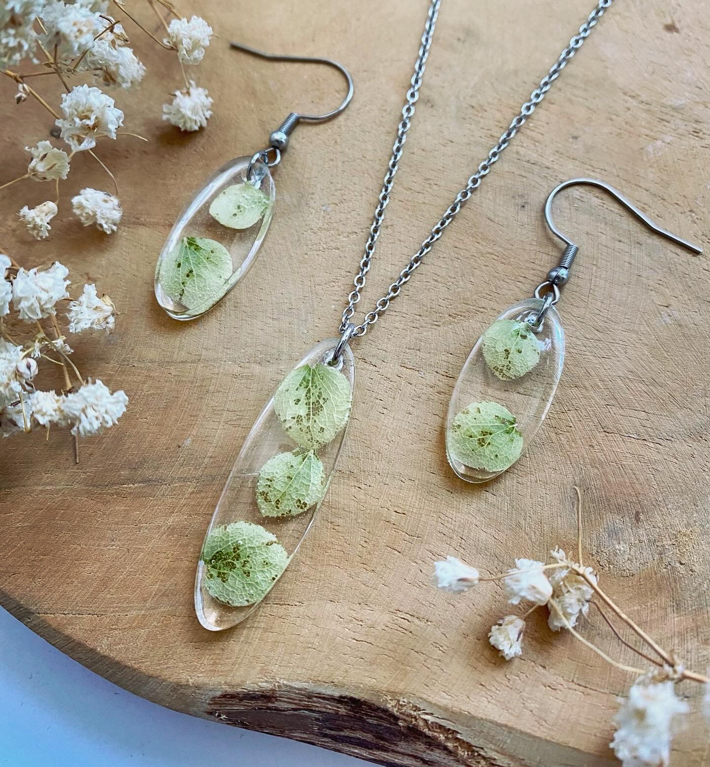 Set s pravými sušenými květy zelené Hortenzie.Set obsahuje:visací náušnicepřívěsek(bez řetízku)
