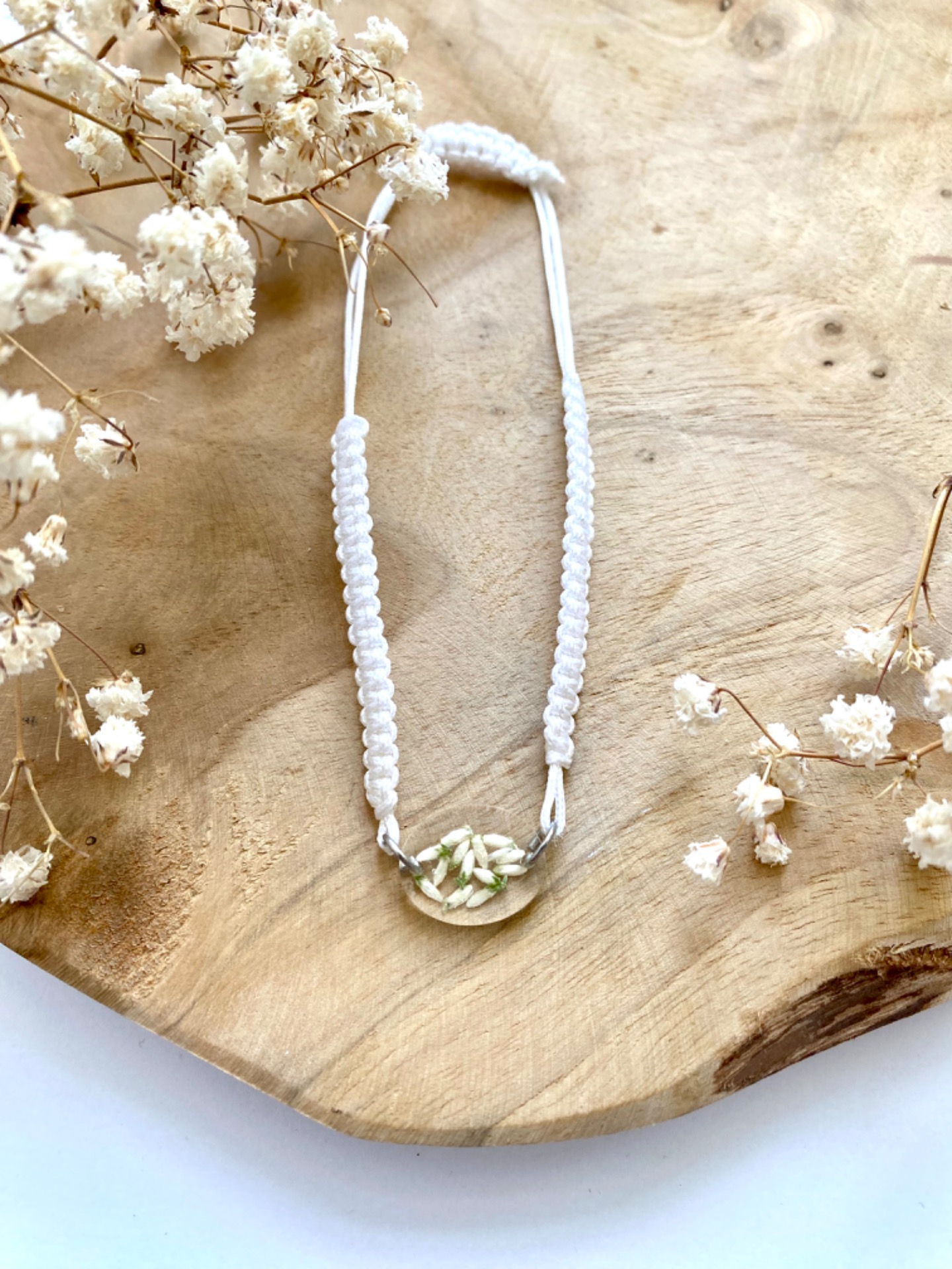 Spojovací díl na náramek s pravými sušenými květy bílého Vřesu.Velikost: 1,7 cm.Součástí spojovacího dílu jsou kroužky z chirurgické oceli.(Cena je uvedena bez náramku)