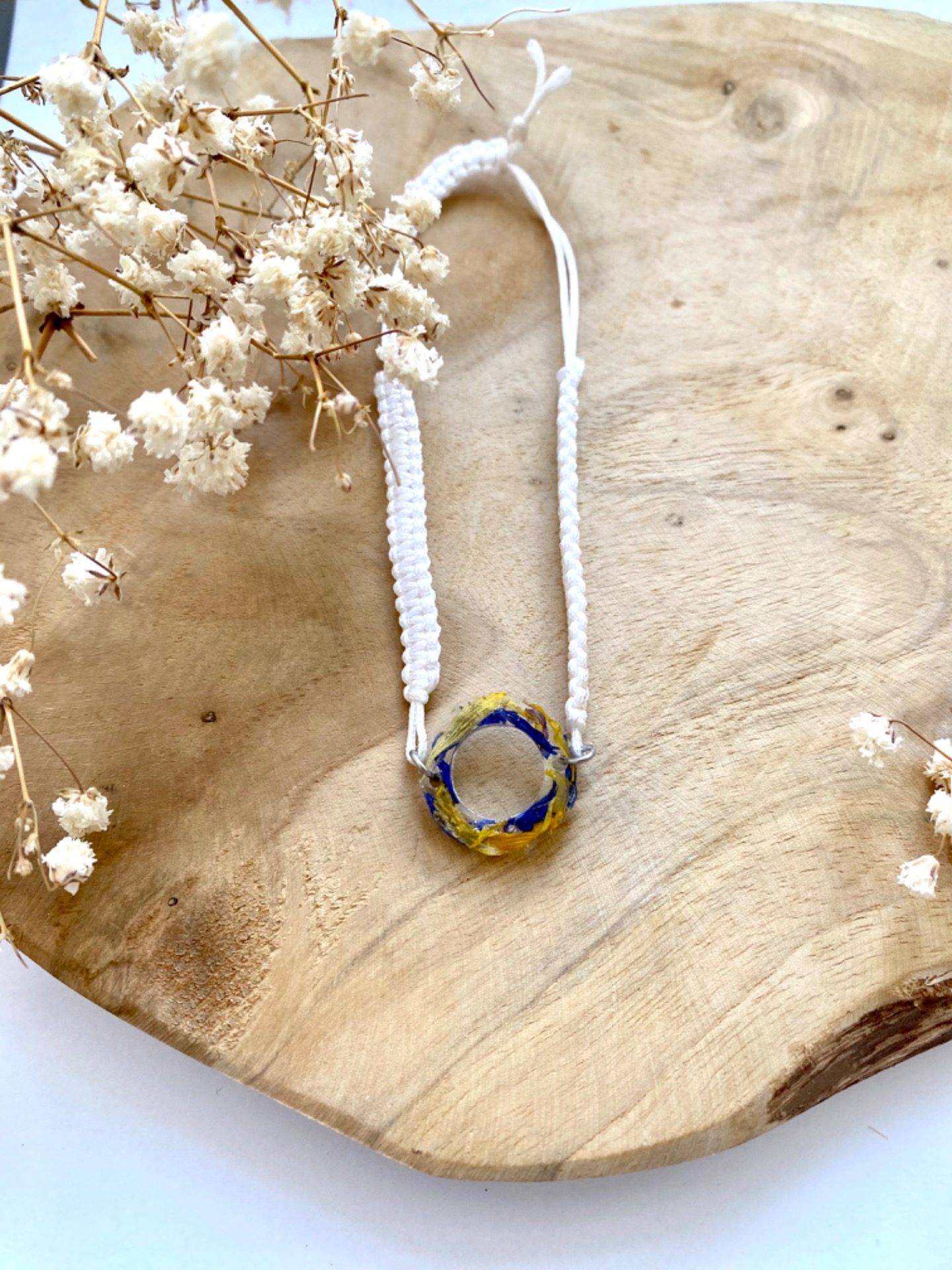 Spojovací díl na náramek s pravými sušenými květy Chrpy a Měsíčku.Velikost: 2 cm.Součástí spojovacího dílu jsou kroužky z chirurgické oceli.(Cena je uvedena bez náramku)