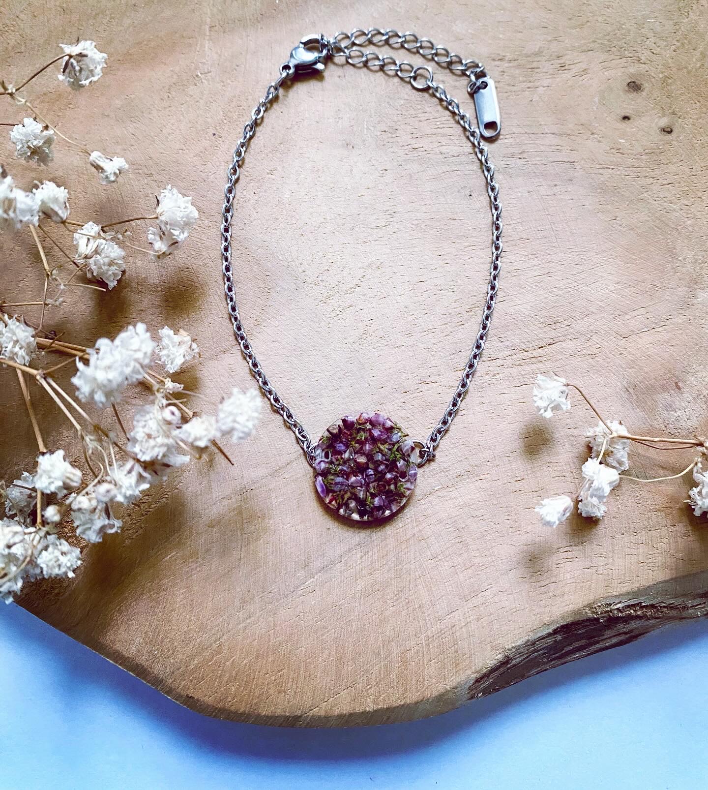Spojovací díl na náramek s pravými sušenými květy fialového Vřesu.Velikost: 1,5 cm.Součástí spojovacího dílu jsou kroužky z chirurgické oceli.(Cena je uvedena bez náramku)