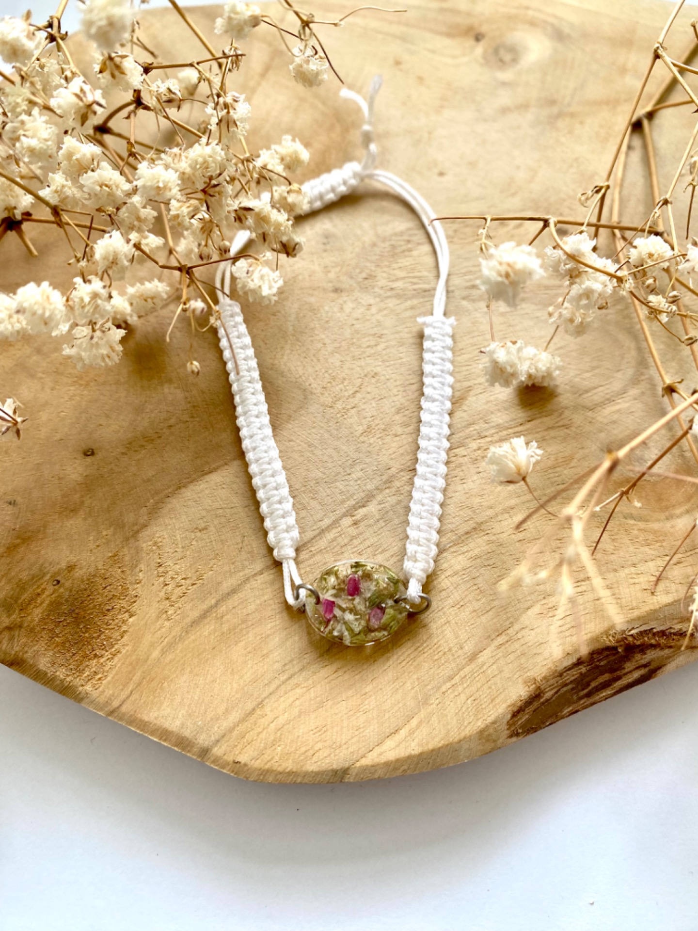 Spojovací díl na náramek s pravými sušenými květy Vřesu Erica a zeleného Mechu.Velikost: 1,7 cm.Součástí spojovacího dílu jsou kroužky z chirurgické oceli.(Cena je uvedena bez náramku)