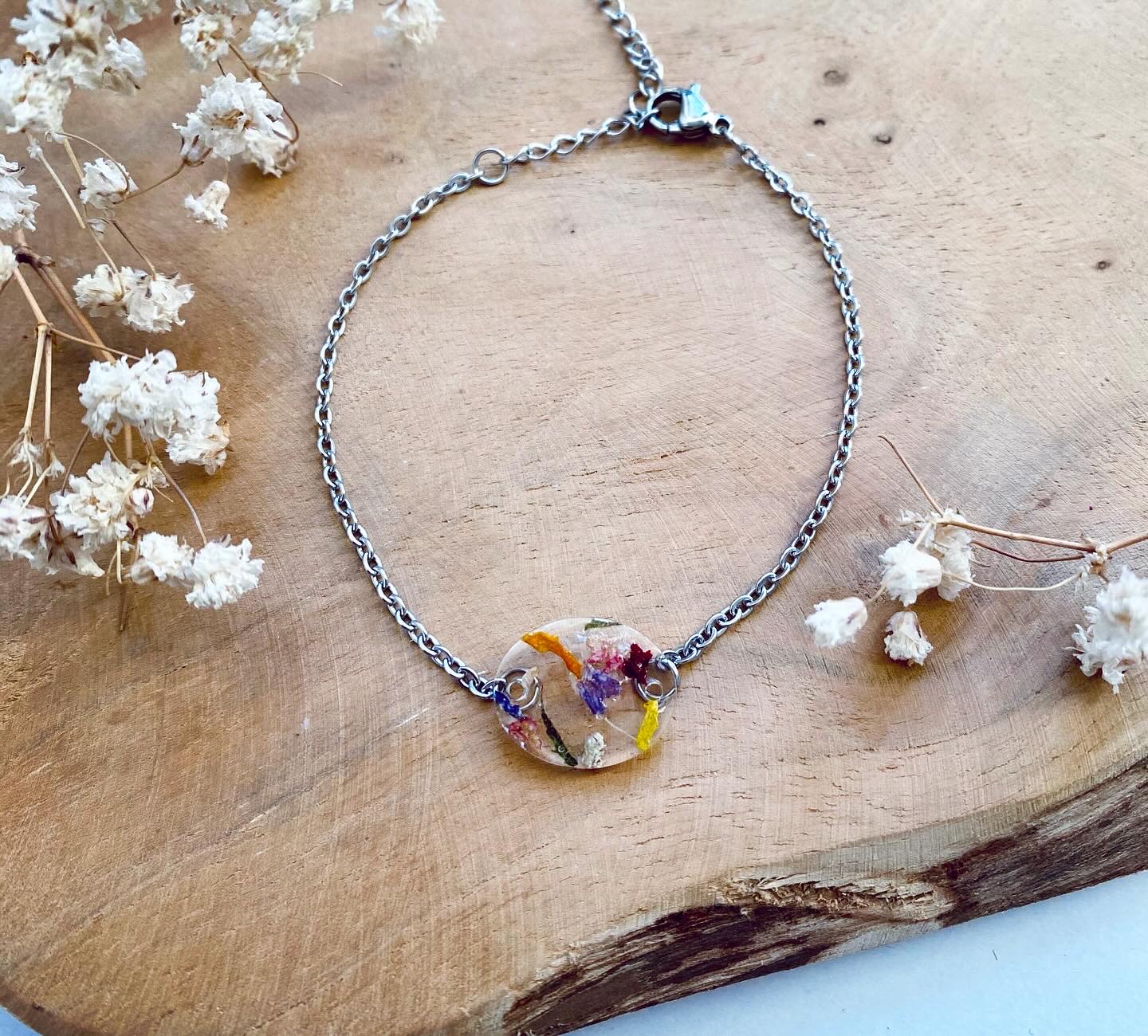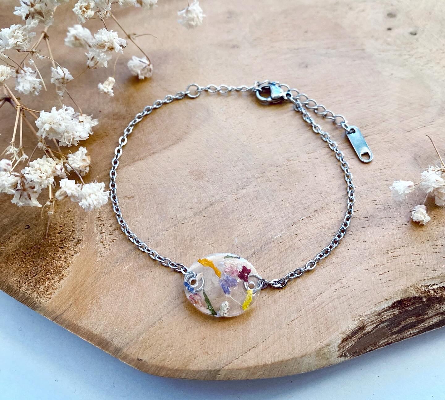 Spojovací díl na náramek s pravými sušenými květy.Velikost: 1,7 cm.Součástí spojovacího dílu jsou kroužky z chirurgické oceli.(Cena je uvedena bez náramku)