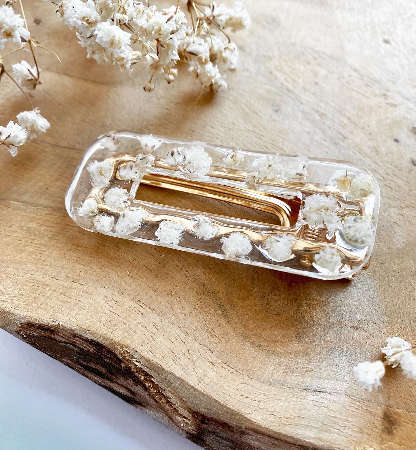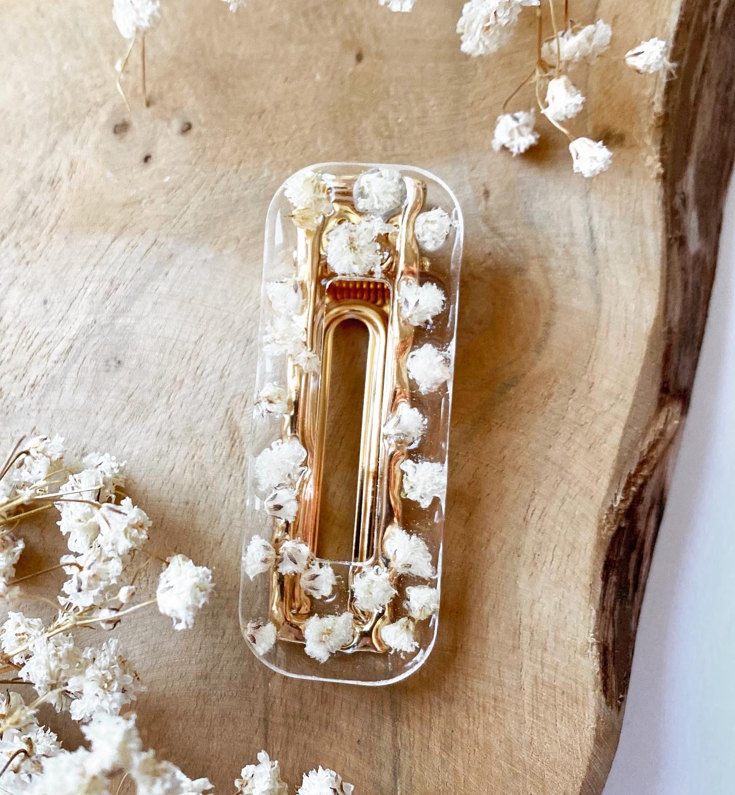 Spona do vlasů s pravými sušenými květy Gypsophila. Velikost: 6 cm.