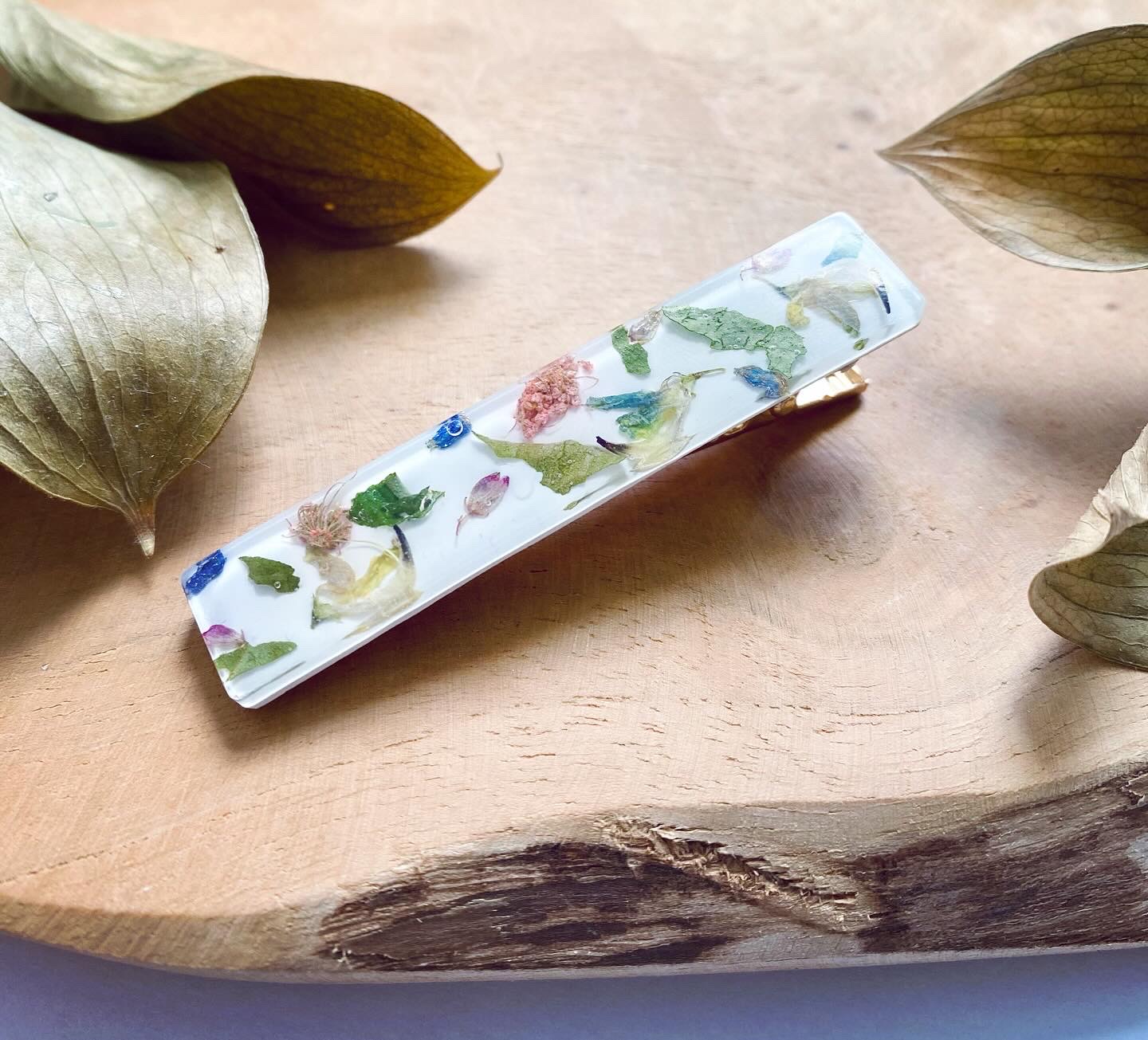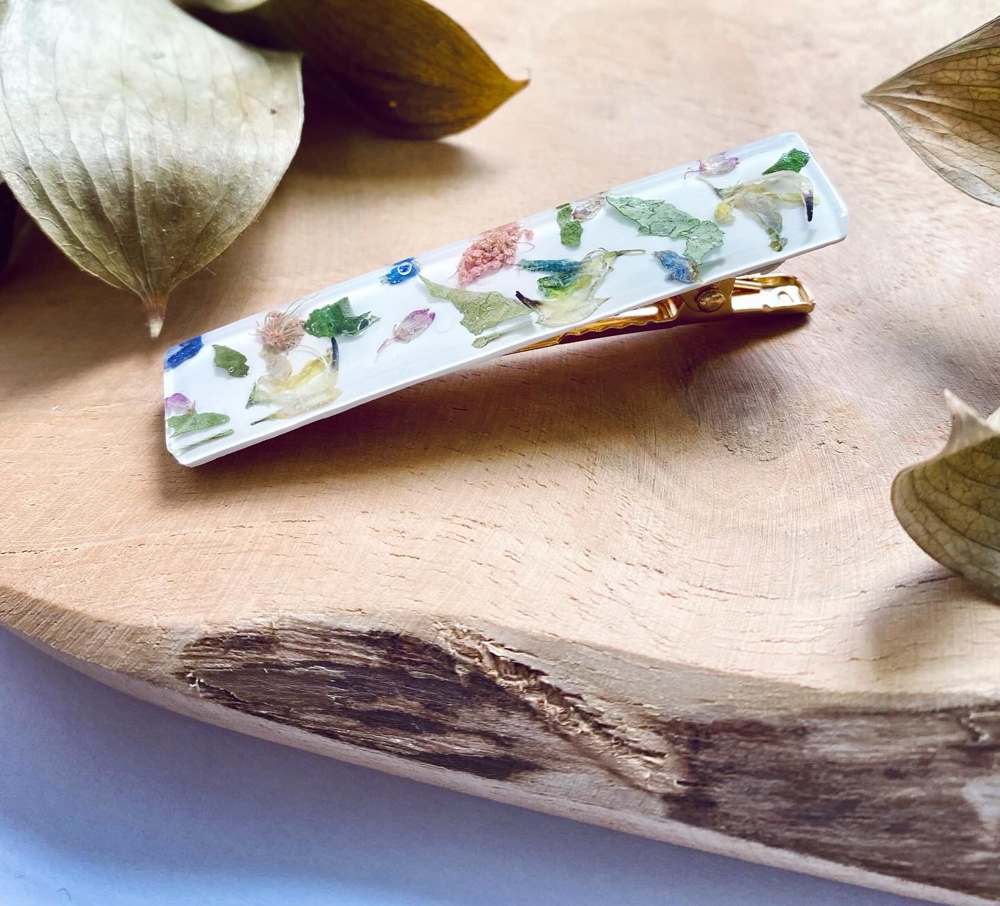 Spona do vlasů s pravými sušenými květy Lučního kvítí.Velikost: 6 cm.