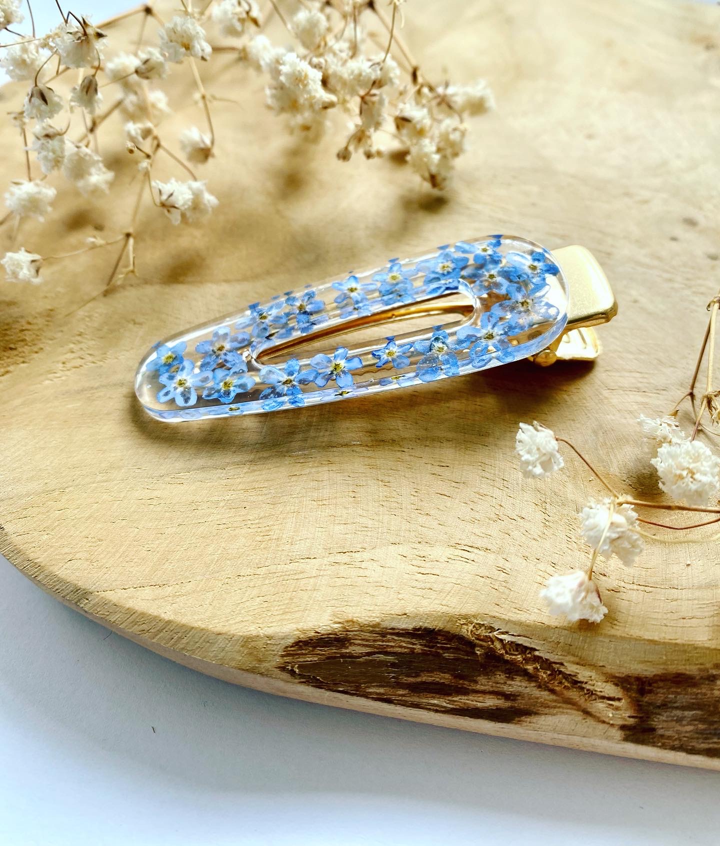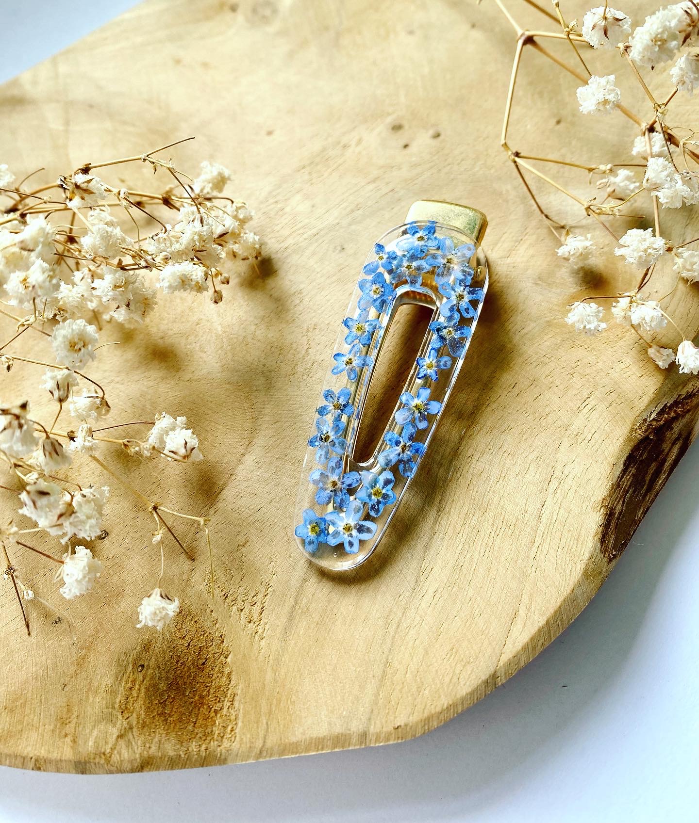 Spona do vlasů s pravými sušenými květy Pomněnky. Velikost: 6 cm.