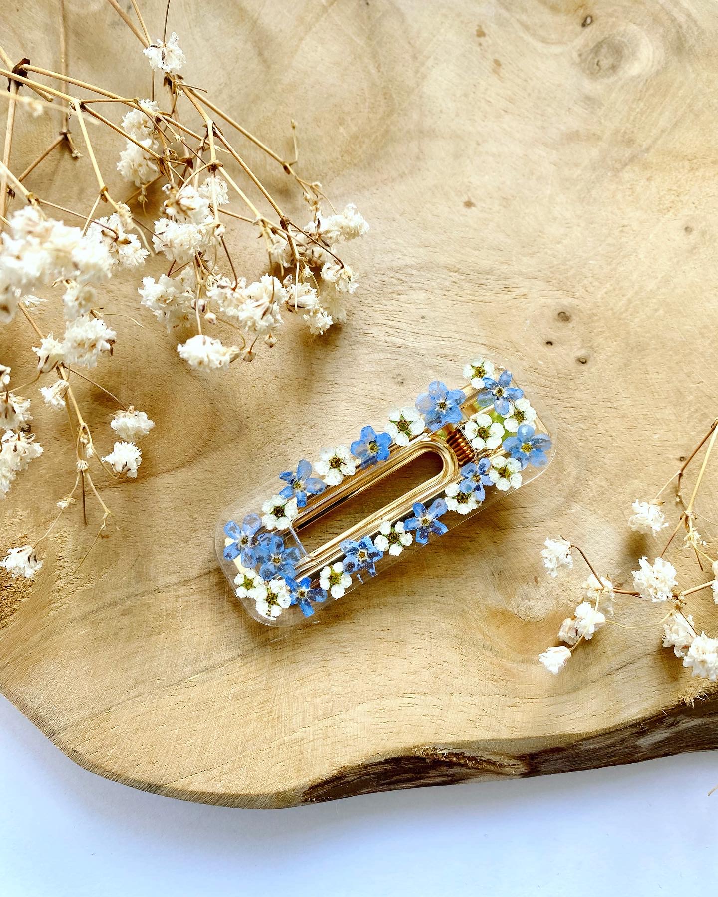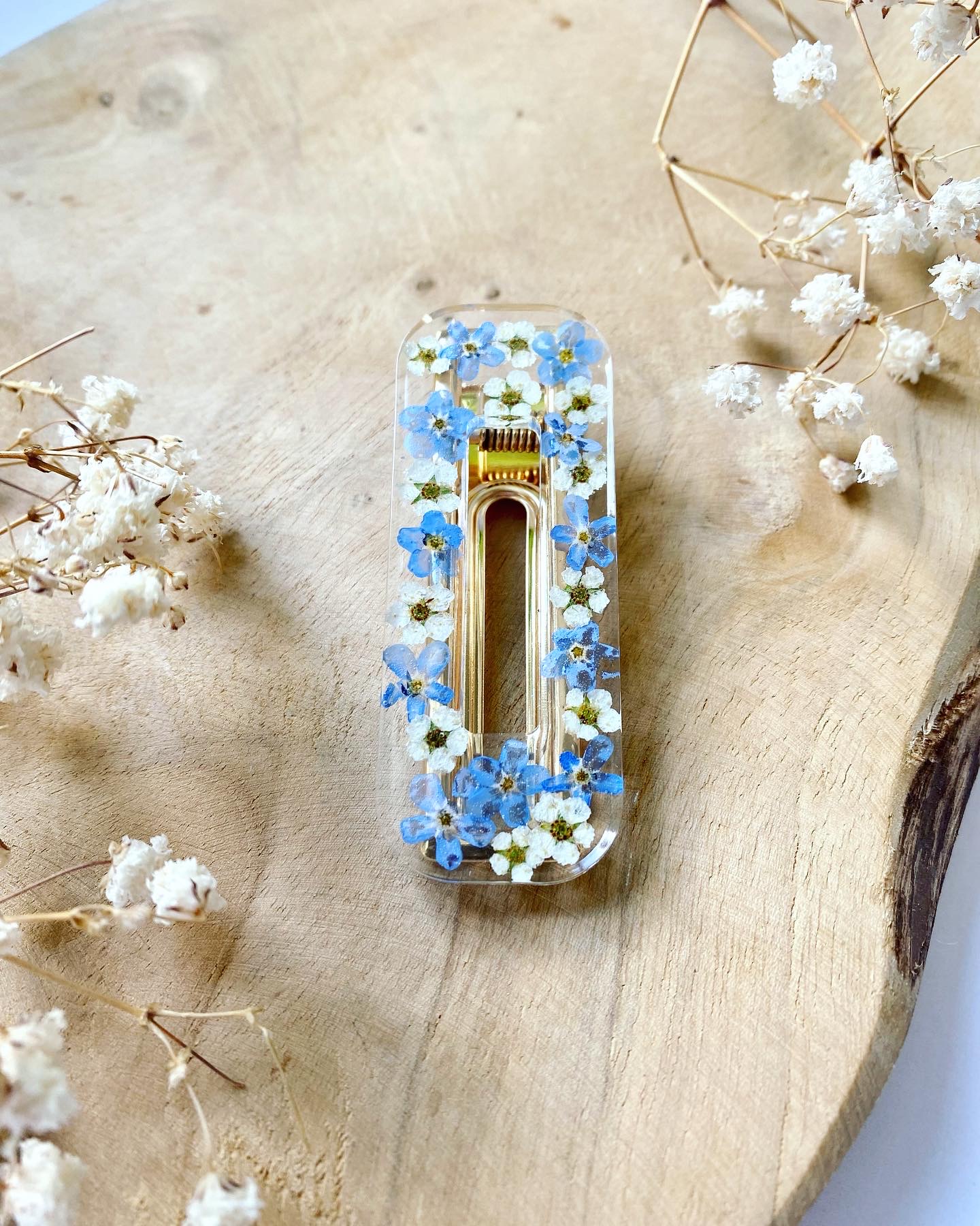 Spona do vlasů s pravými sušenými květy Pomněnky a Tavolníku. Velikost: 6 cm.