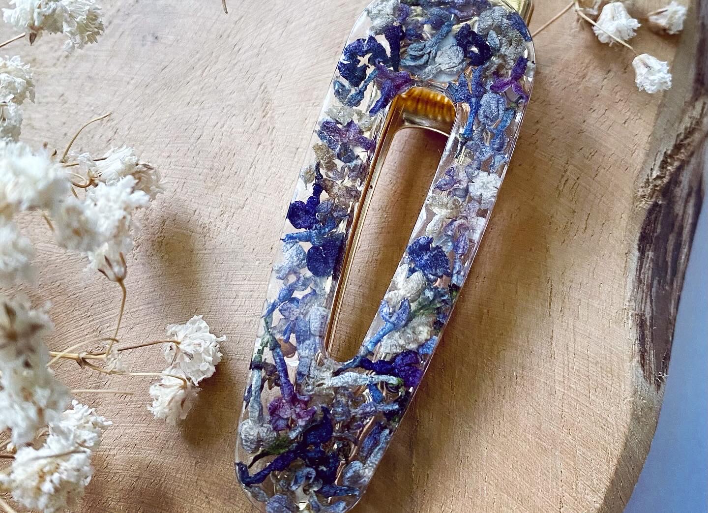 Spona do vlasů s pravými sušenými květy Šeříku .Velikost: 6 cm.