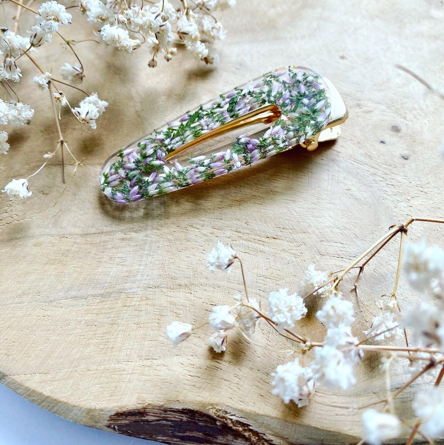 Spona do vlasů s pravými sušenými květy Vřesu. Velikost: 6 cm.