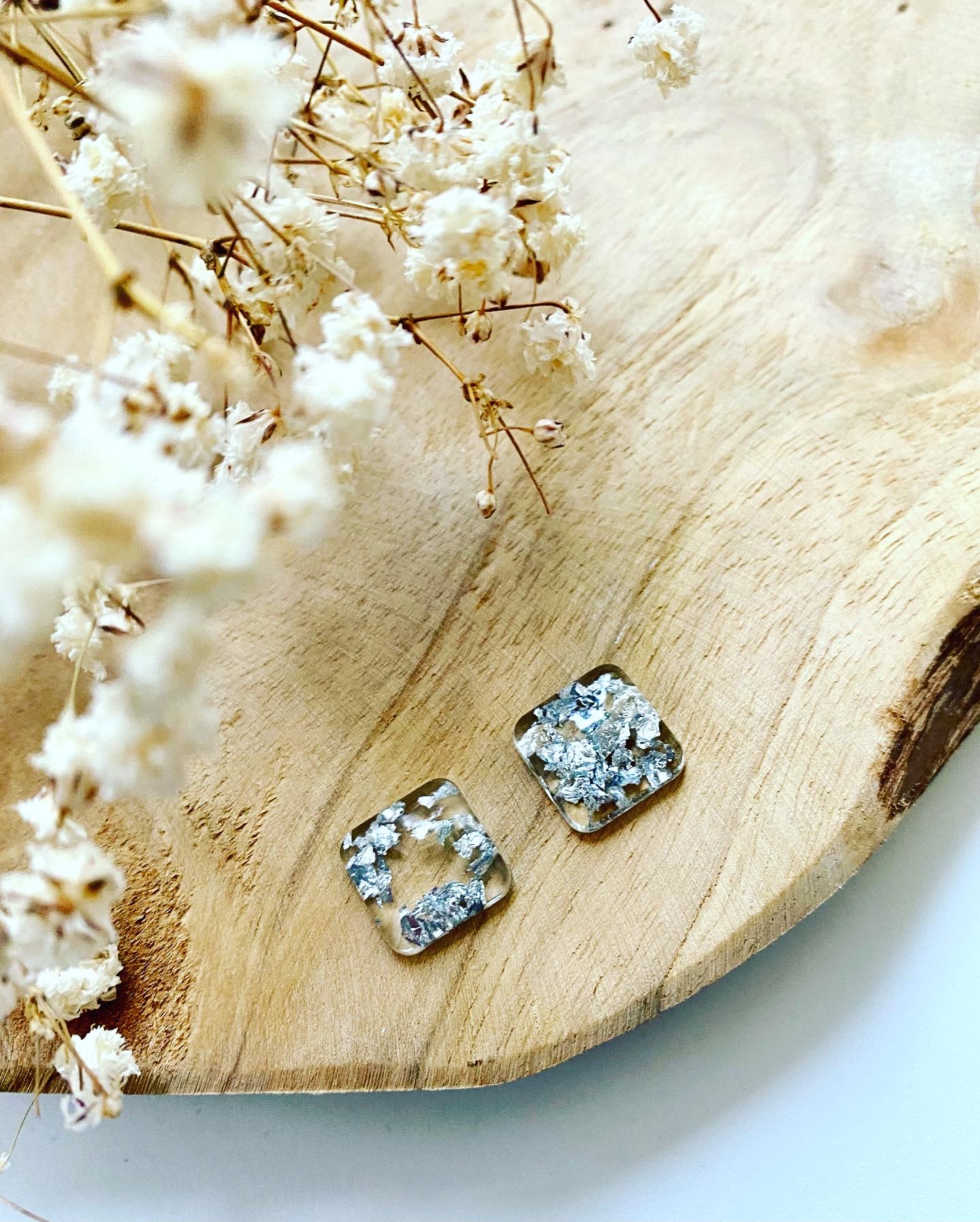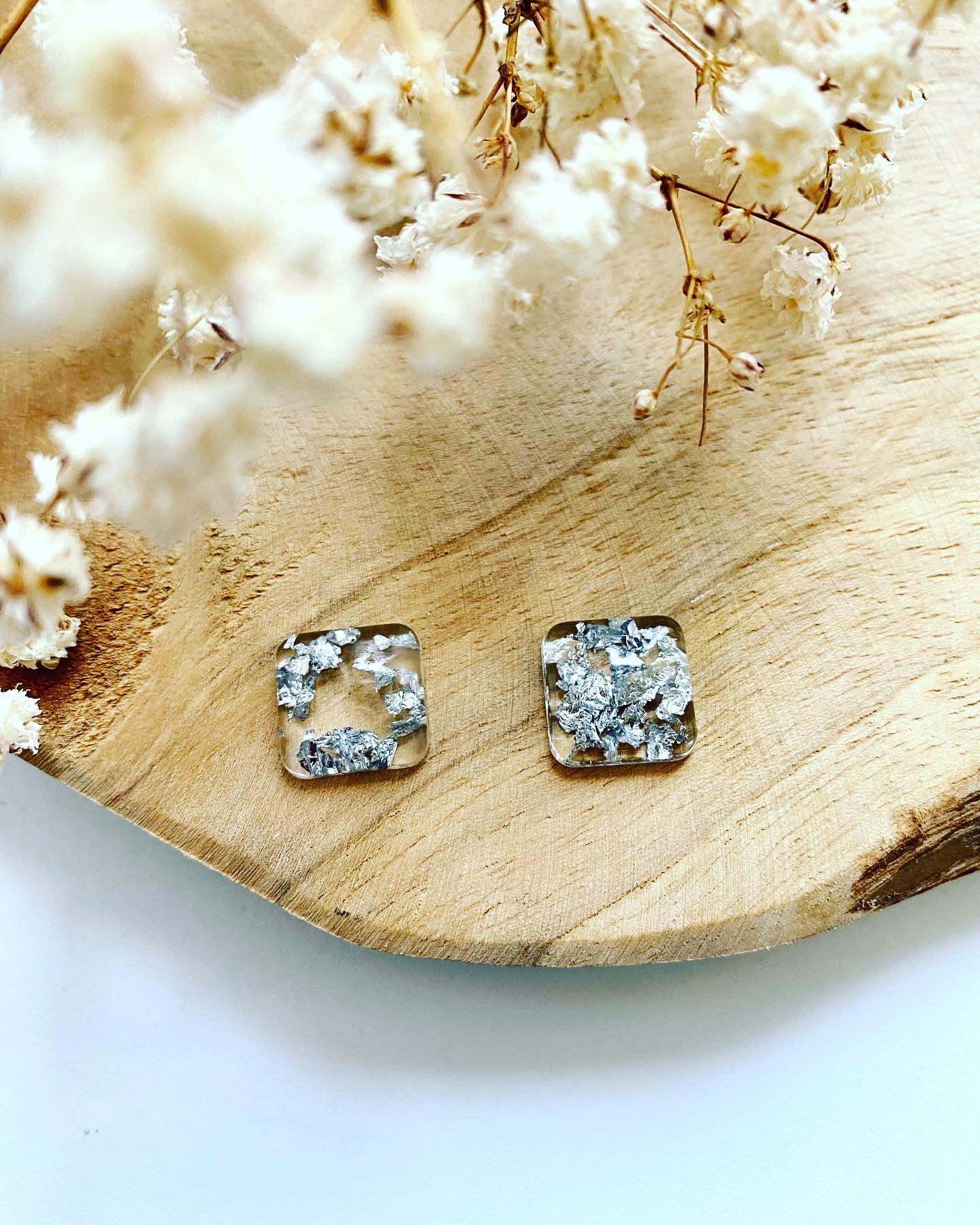 Stříbrná kolekce.Náušnice malé čtverce se stříbrnými plátky.Velikost: 1 cm.Puzety: chirurgická ocel.