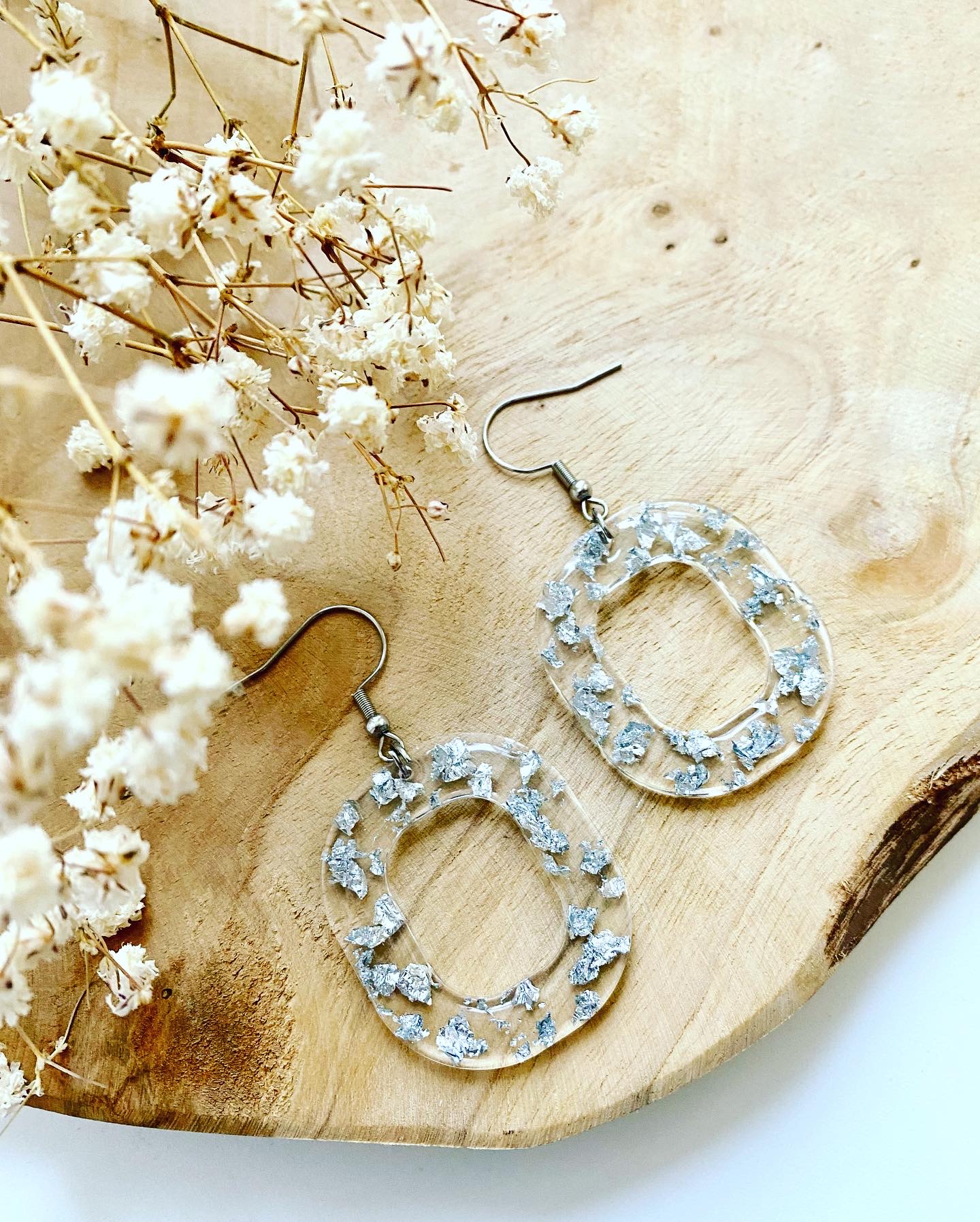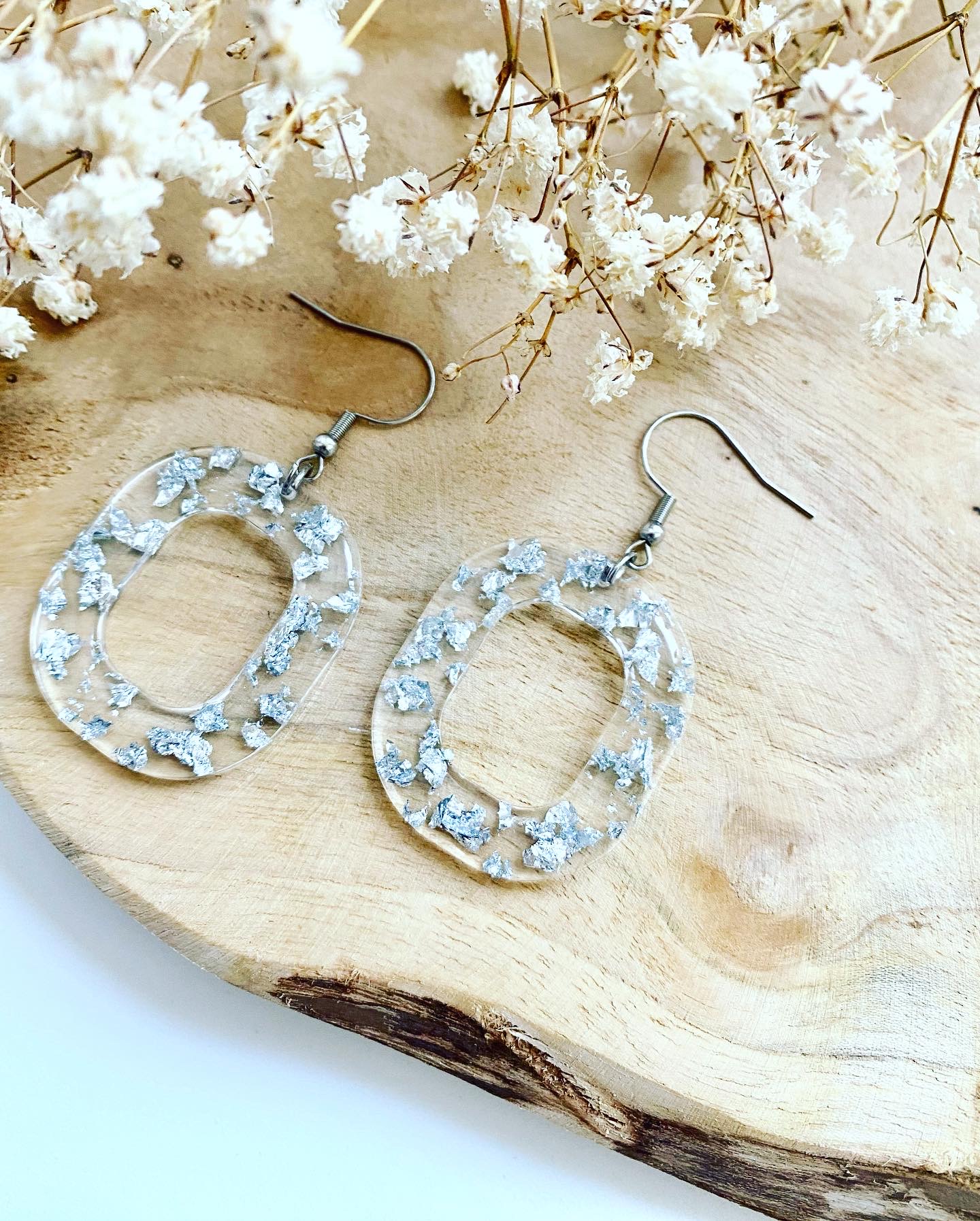 Stříbrná kolekce.Náušnice velké visací ovály se stříbrnými plátky.Velikost: 3,5 cm / 3 cm.Háčky: chirurgická ocel.