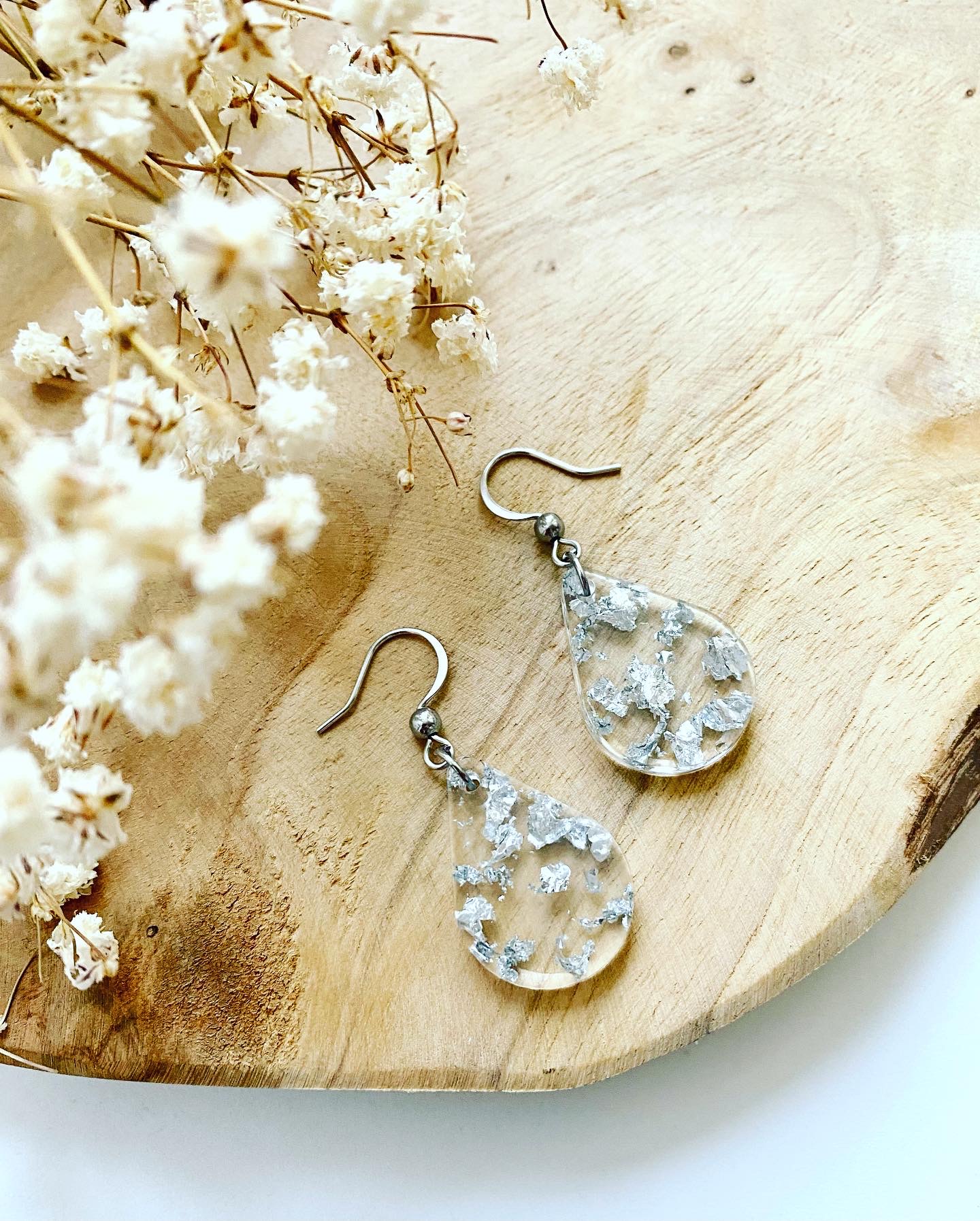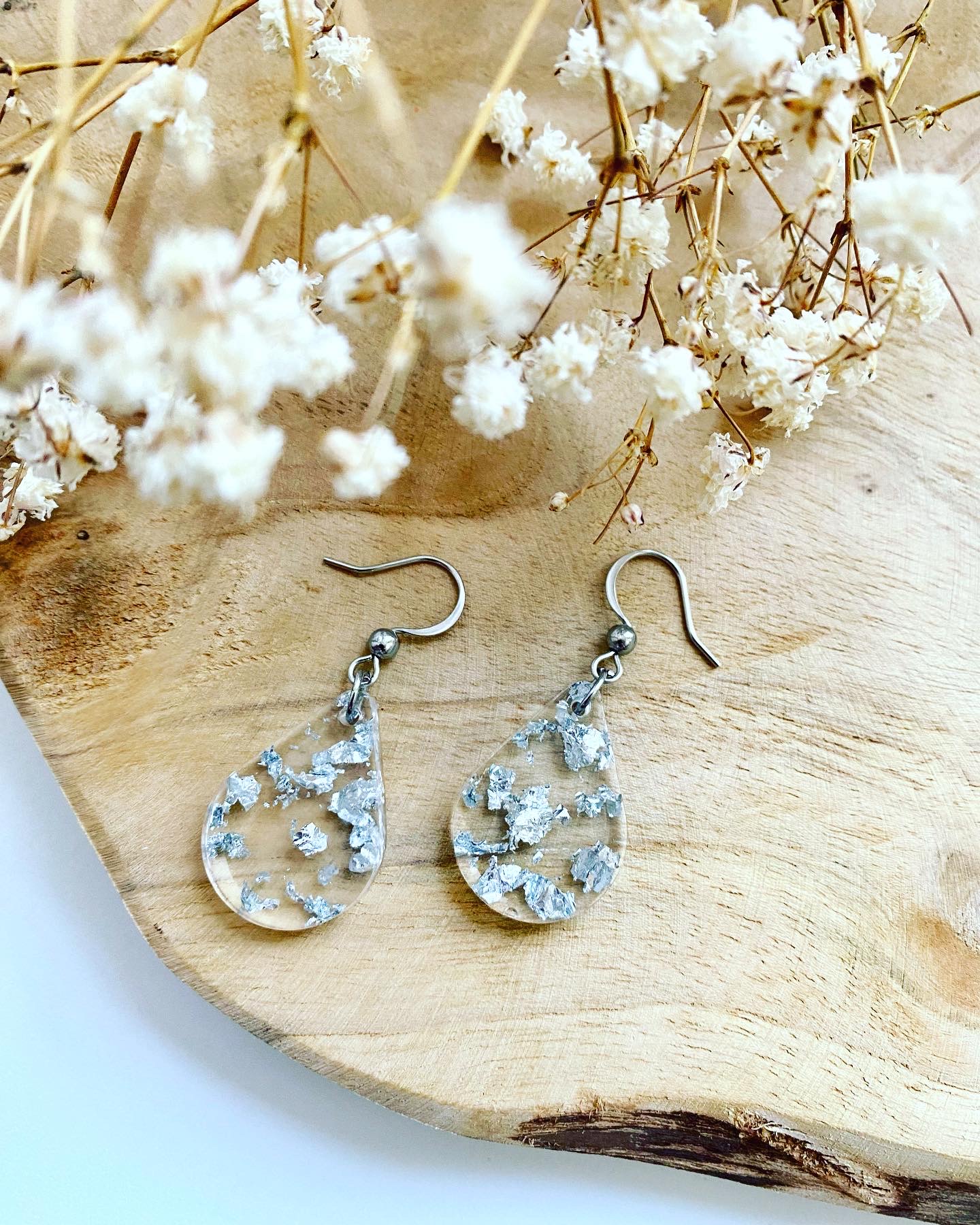 Stříbrná kolekce.Náušnice visací kapky se stříbrnými plátky.Velikost: 2,4 cm.Háčky: chirurgická ocel.
