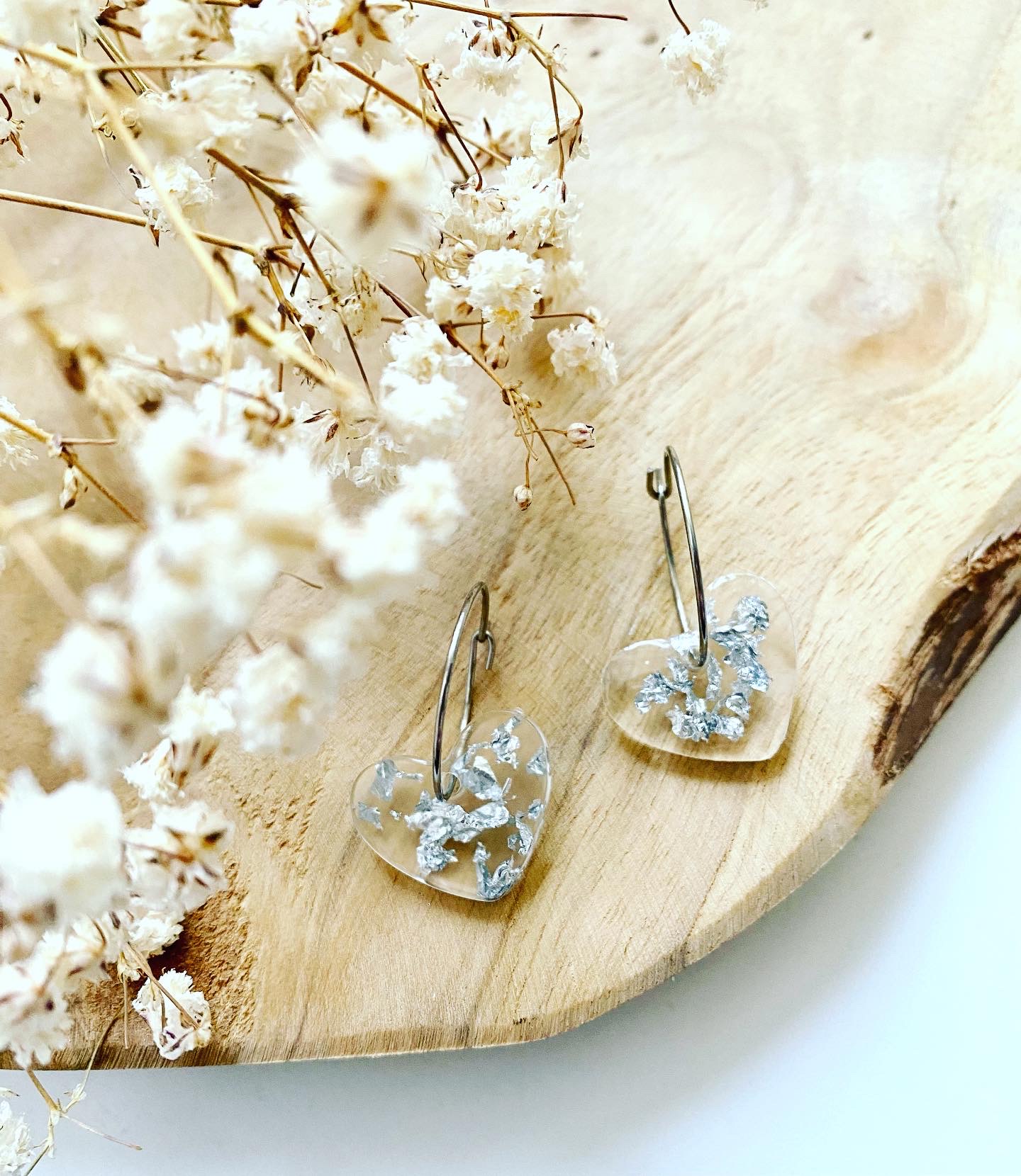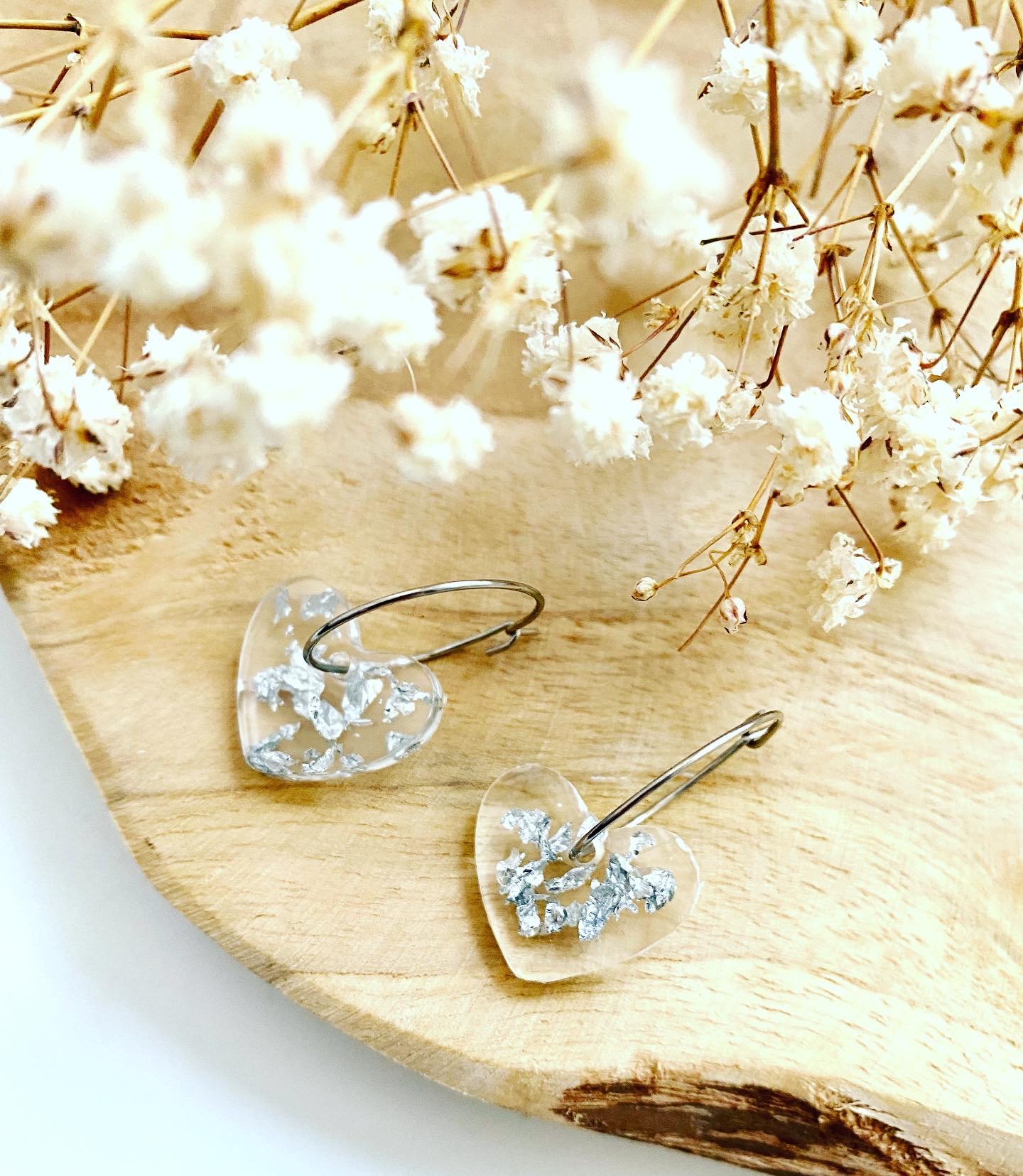 Stříbrná kolekce.Náušnice visací srdíčka se stříbrnými plátky.Velikost: 1,8 cm.Kruhy: chirurgická ocel.