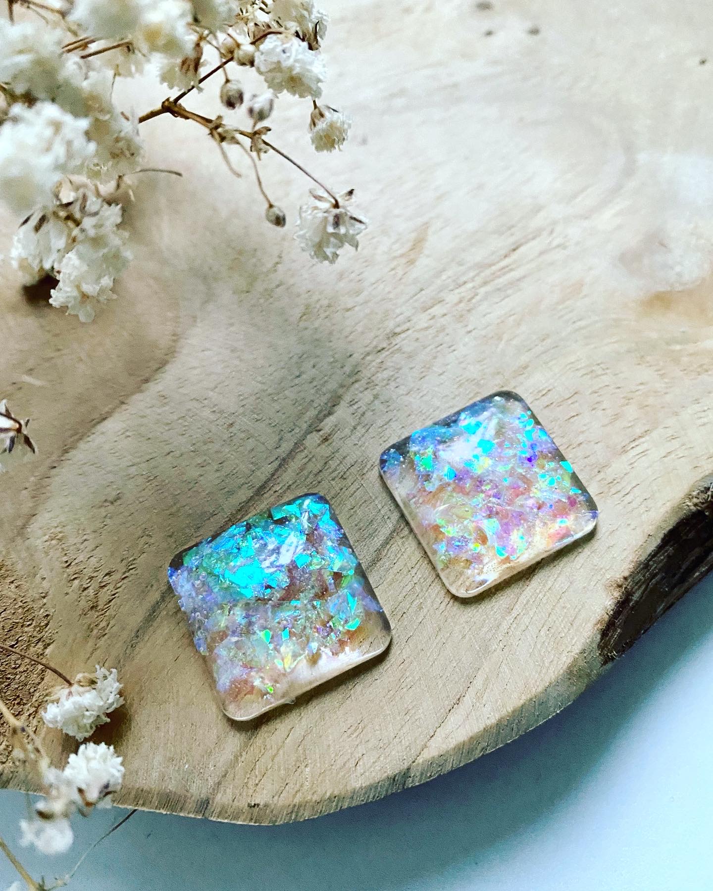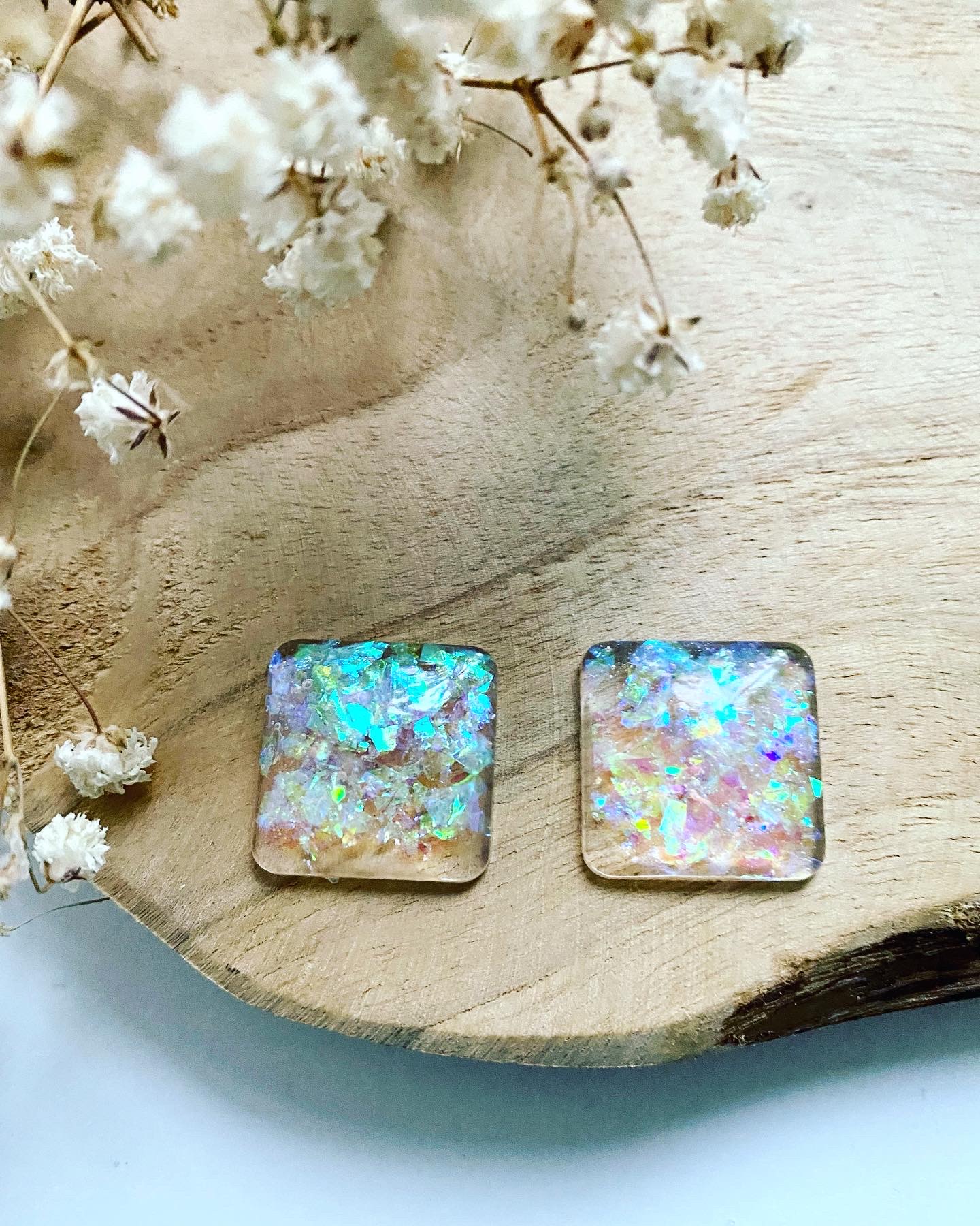 Třpytivá bílá kolekce.Náušnice velké čtverce s bílými glitry.Velikost: 2 cm.Puzety: chirurgická ocel.