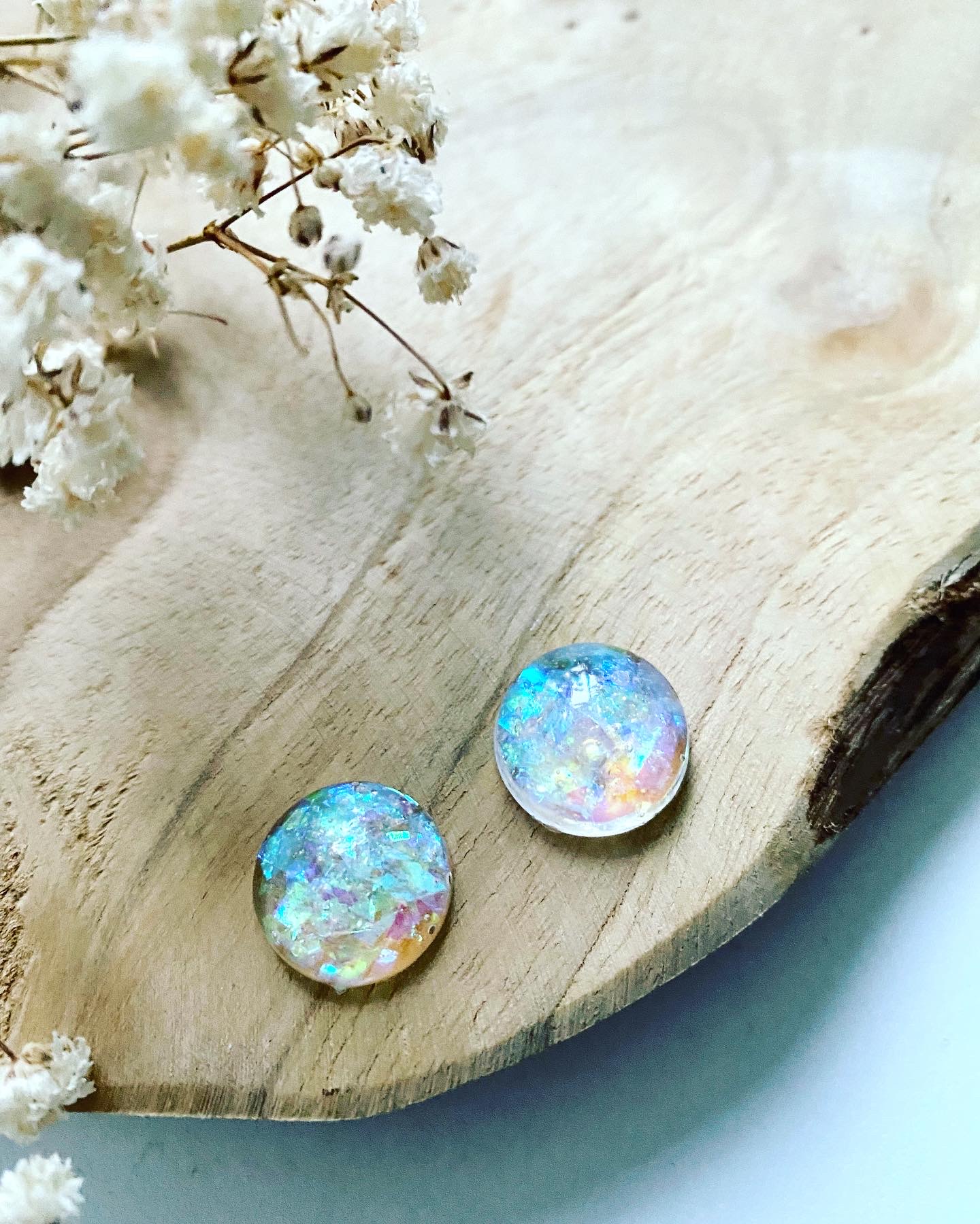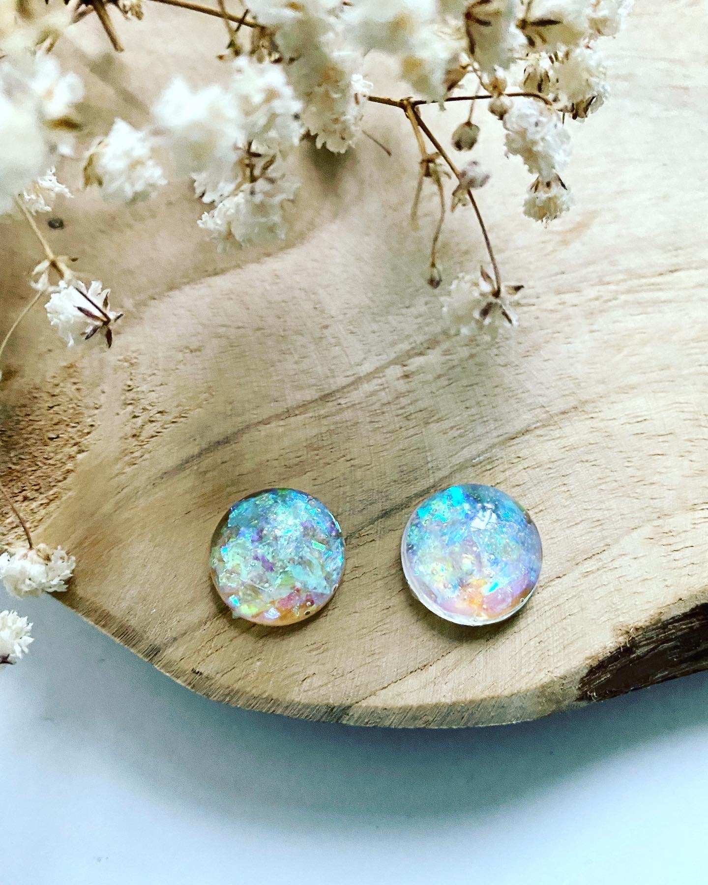 Třpytivá bílá kolekce.Náušnice velké půlkuličky s bílými glitry.Velikost: 1,8 cm.Puzety: chirurgická ocel.