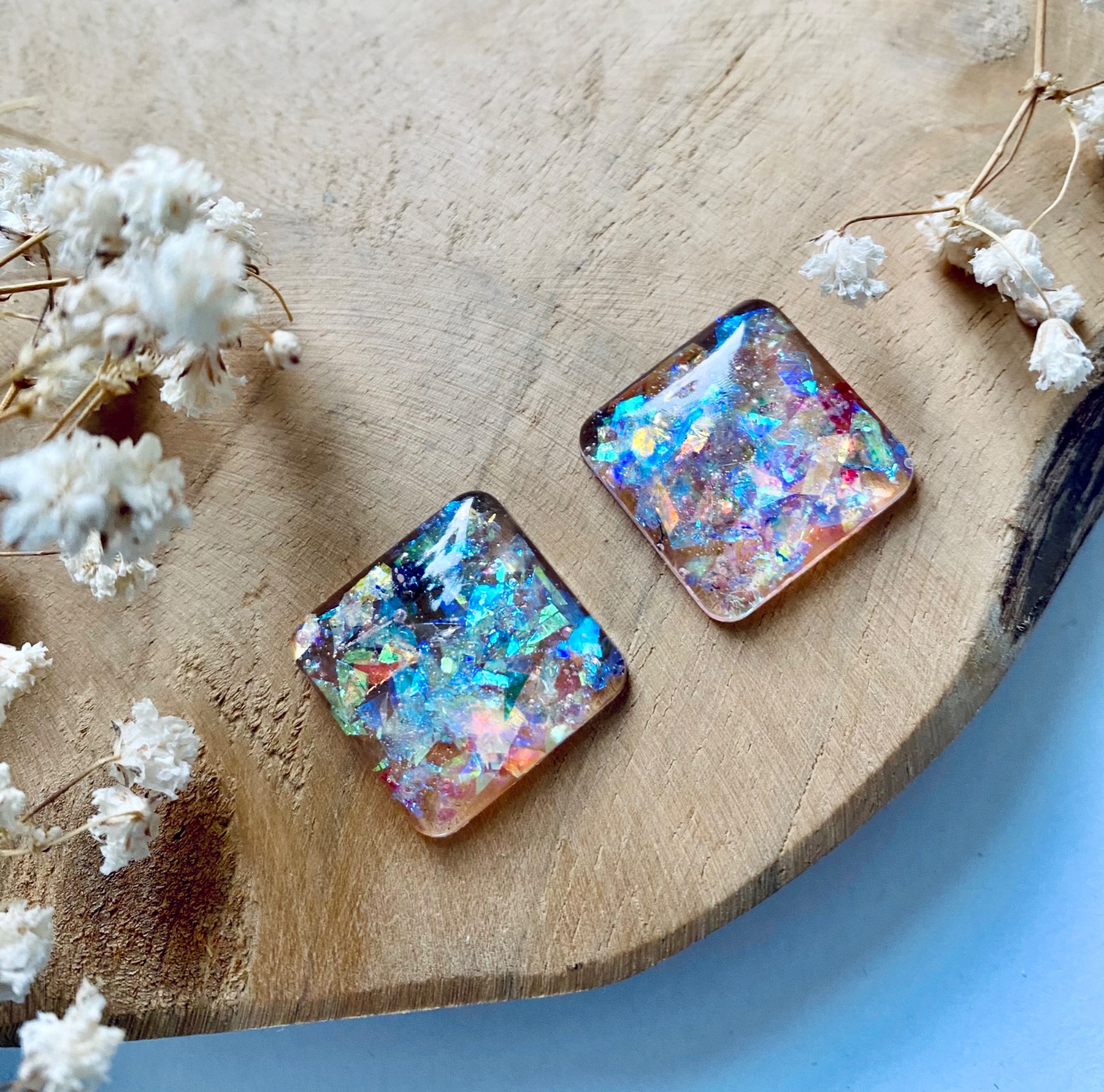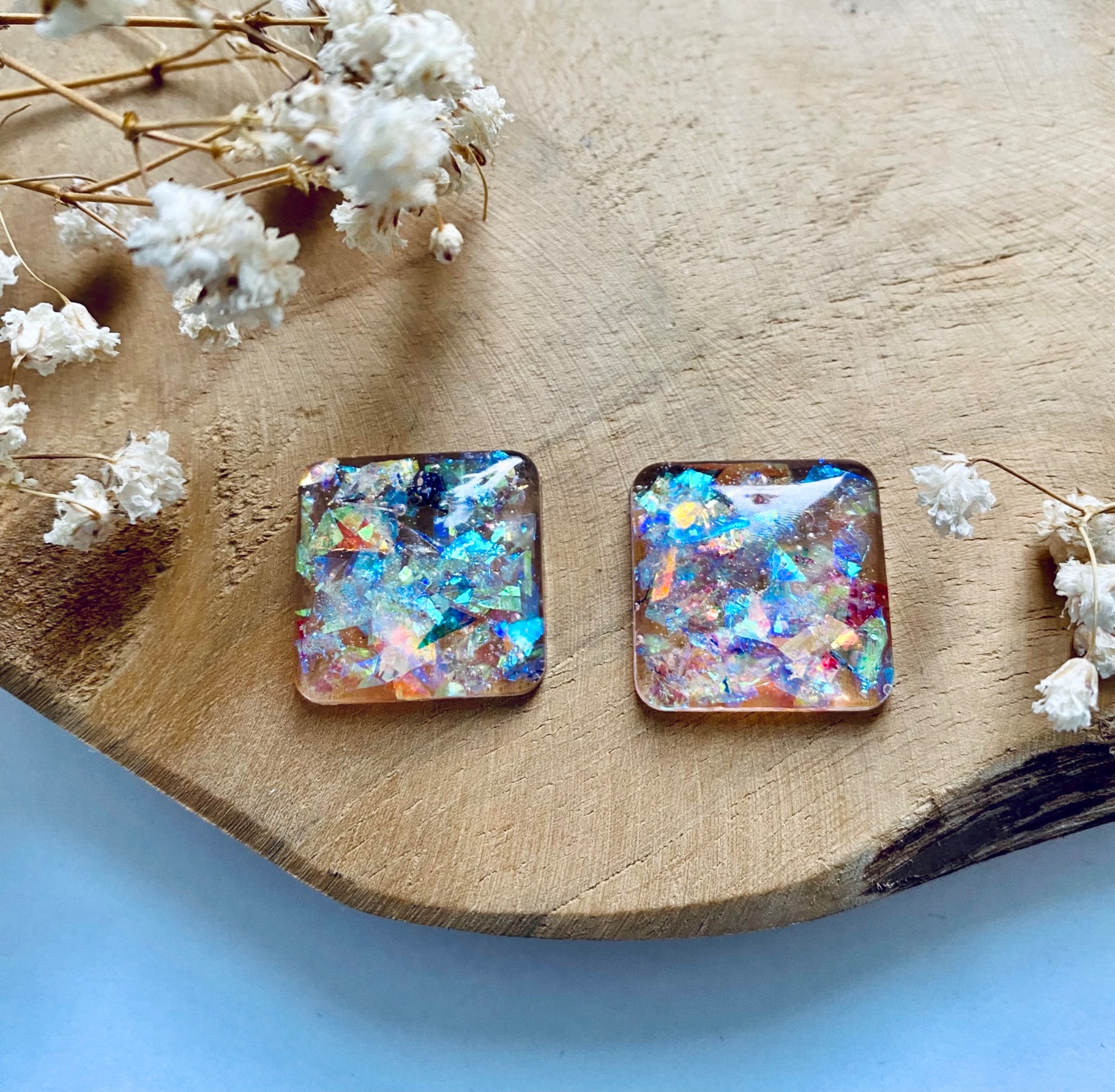 Třpytivá modrá kolekce.Náušnice velké čtverce s modrými glitry Velikost: 2 cm.Puzety: chirurgická ocel.
