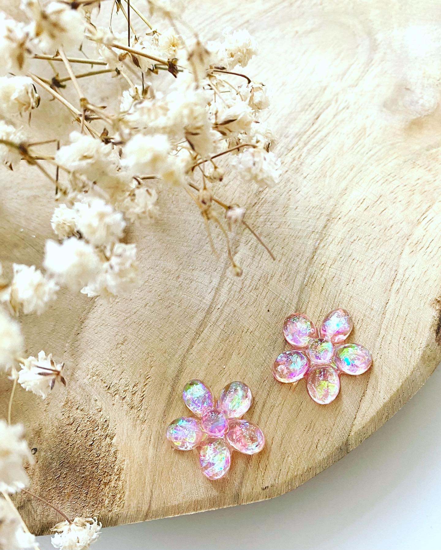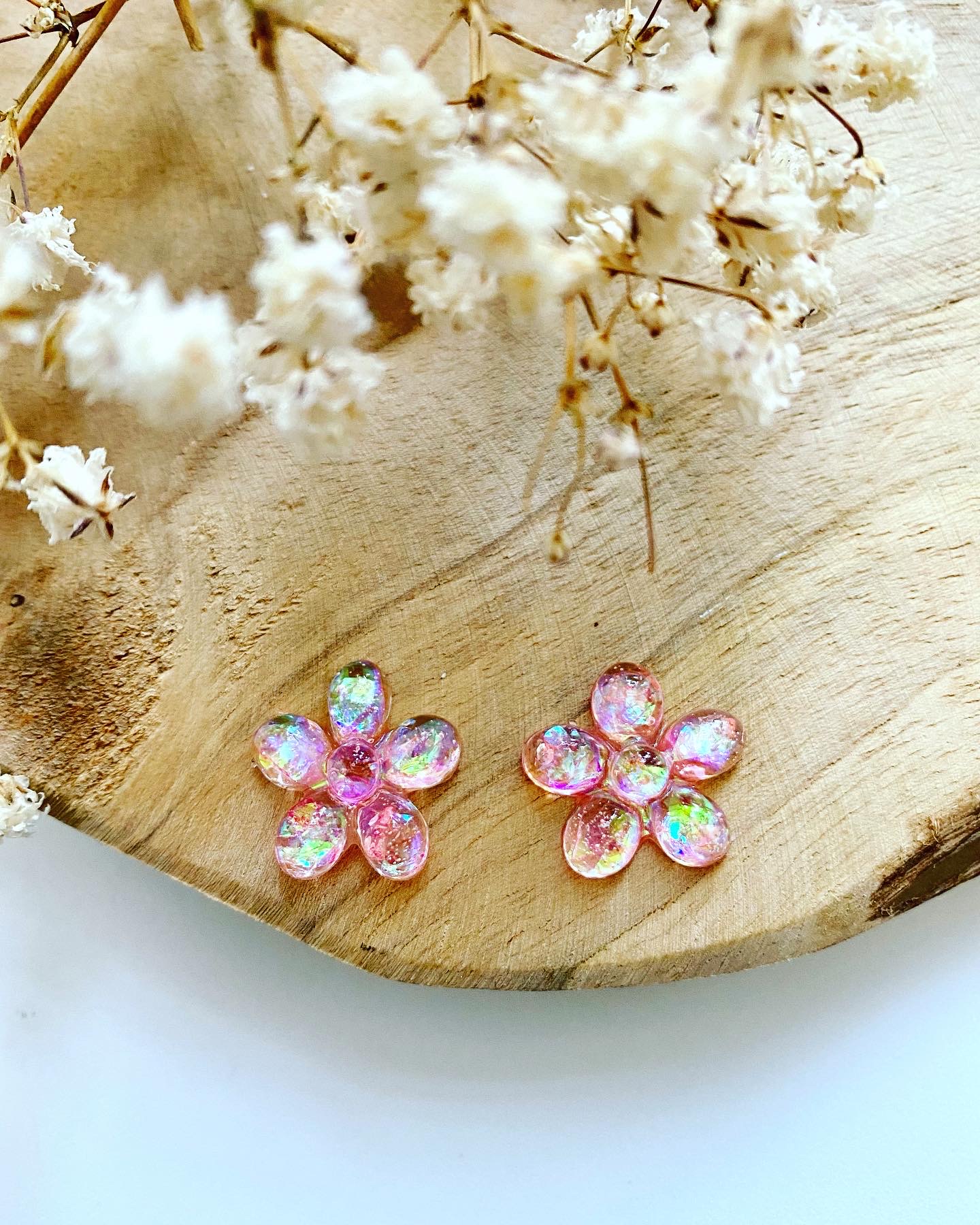 Třpytivá růžová kolekce.Náušnice kytičky s růžovými glitry.Velikost: 1,7 cm.Puzety: chirurgická ocel.