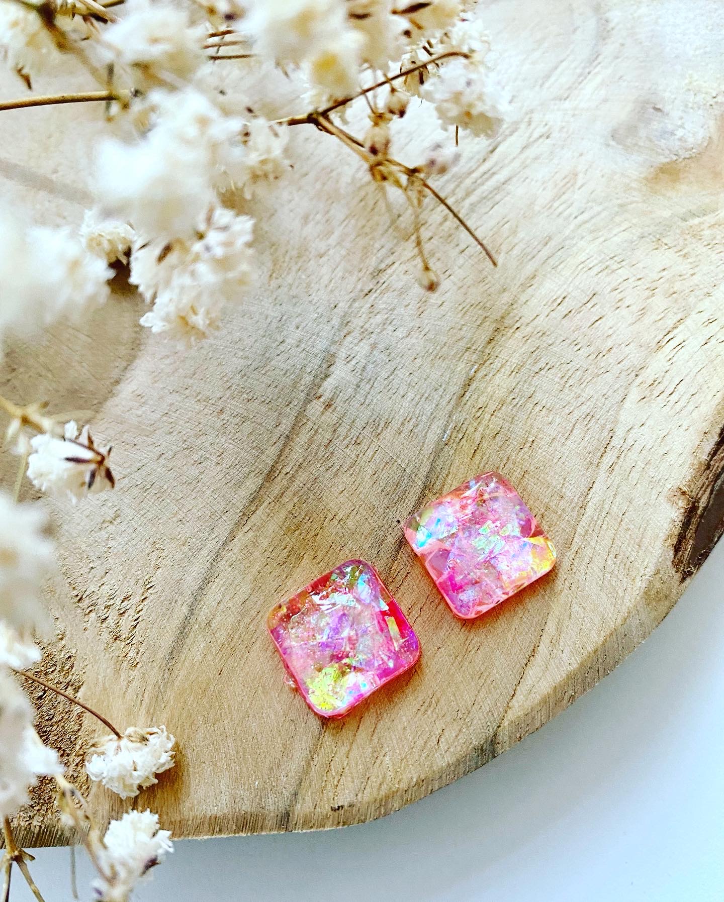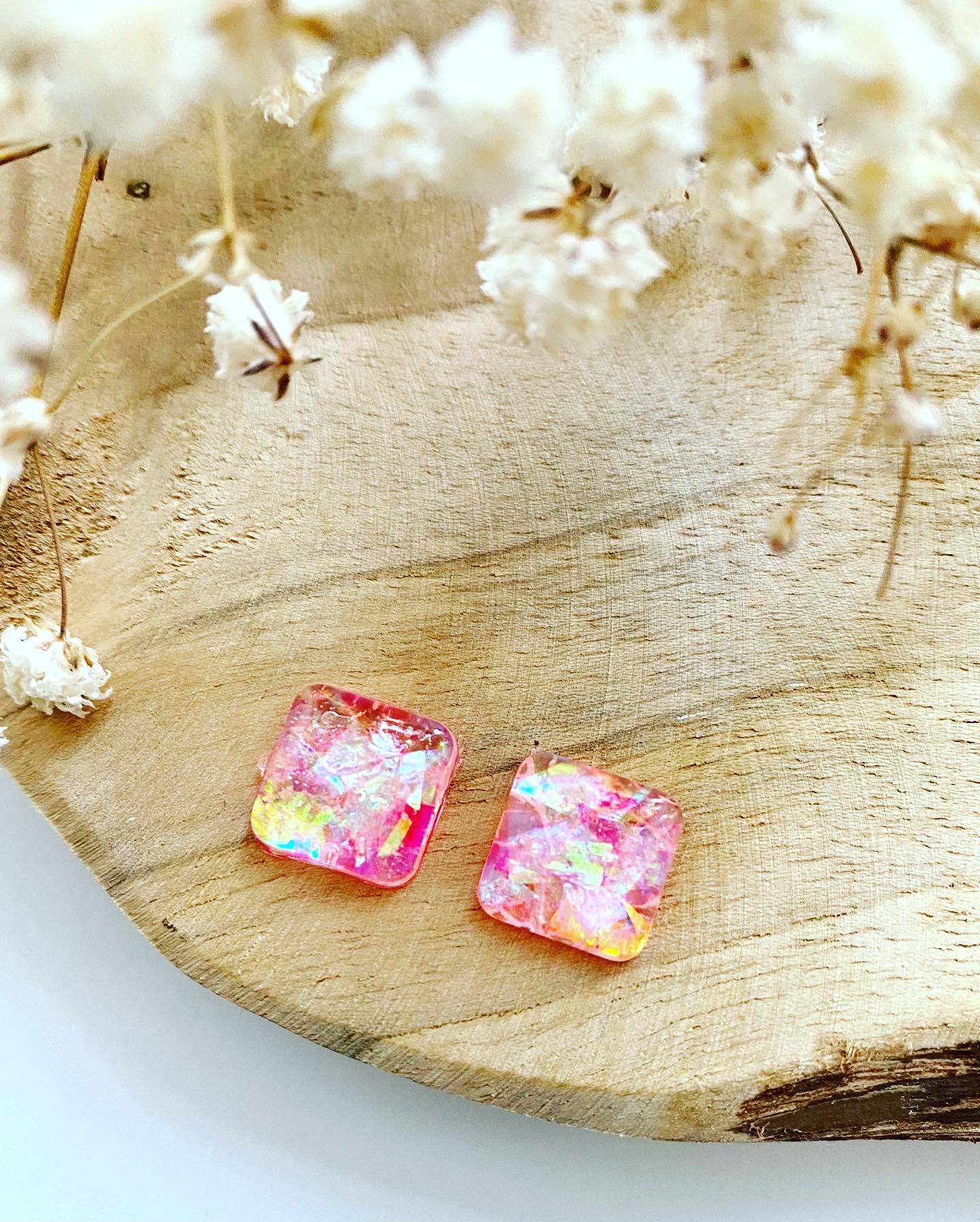 Třpytivá růžová kolekce.Náušnice malé čtverce s růžovými glitry.Velikost: 1 cm.Puzety: chirurgická ocel.