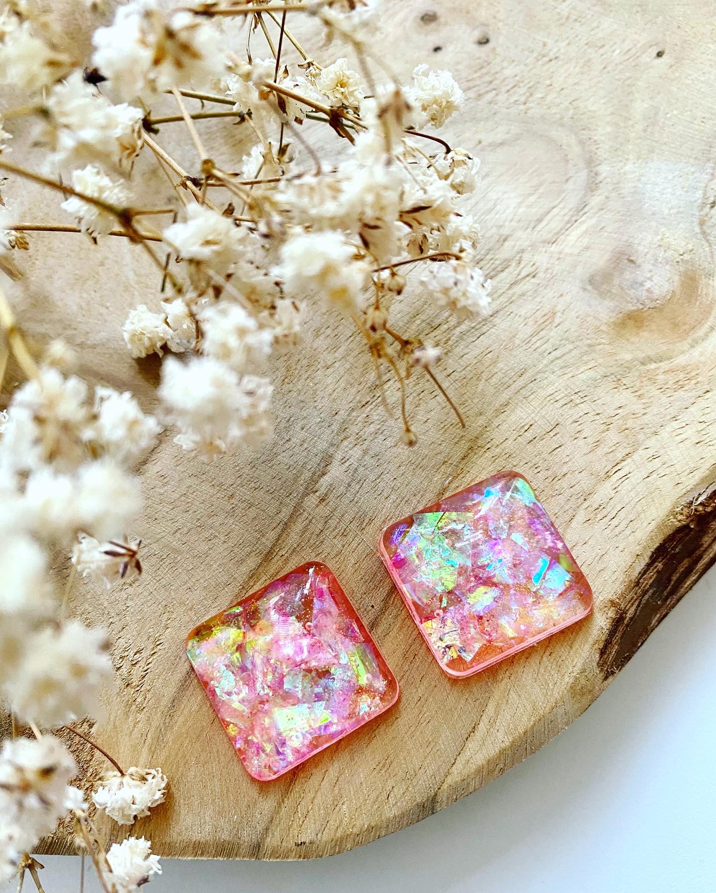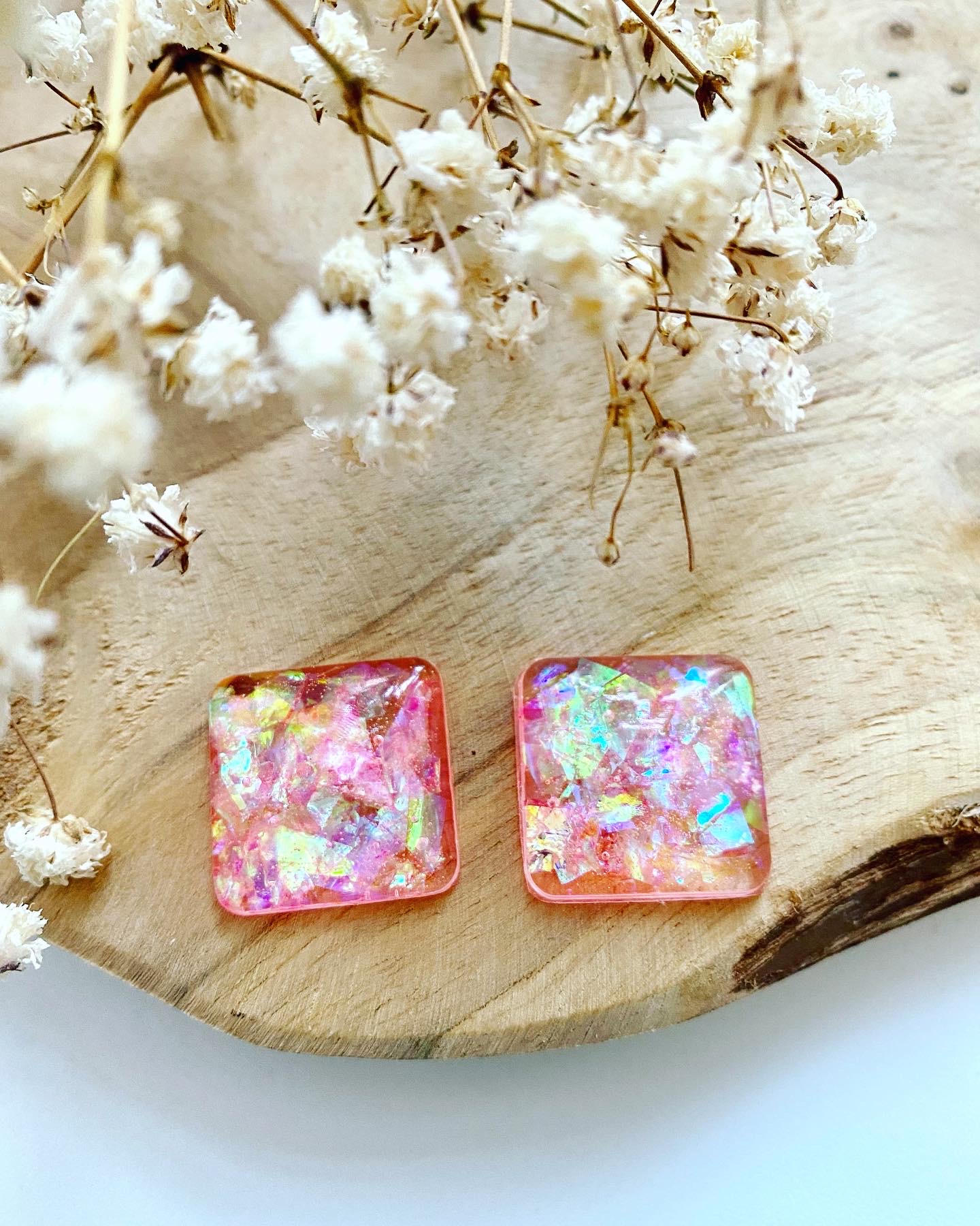 Třpytivá růžová kolekce.Náušnice velké čtverce s růžovými glitry.Velikost: 2 cm.Puzety: chirurgická ocel.
