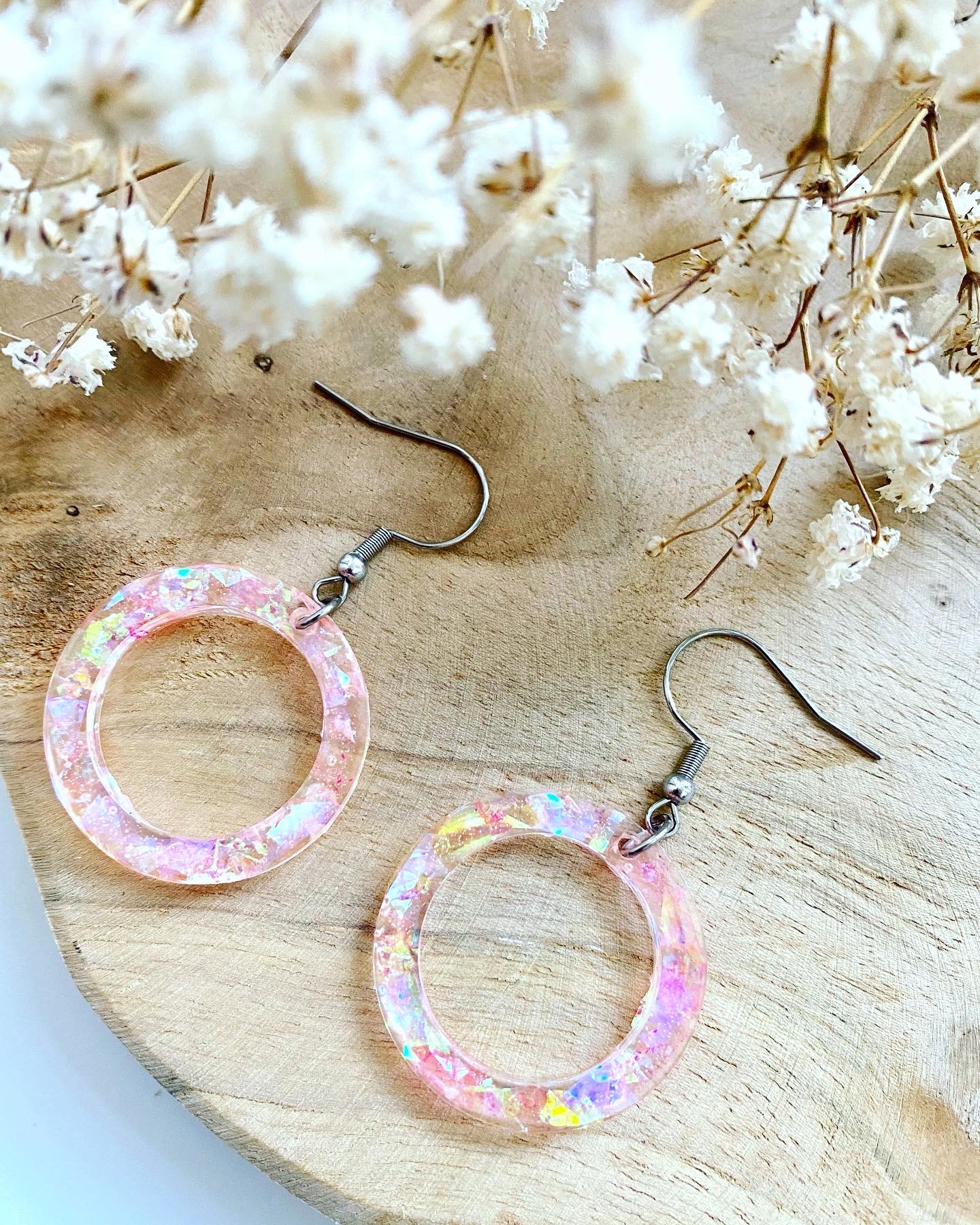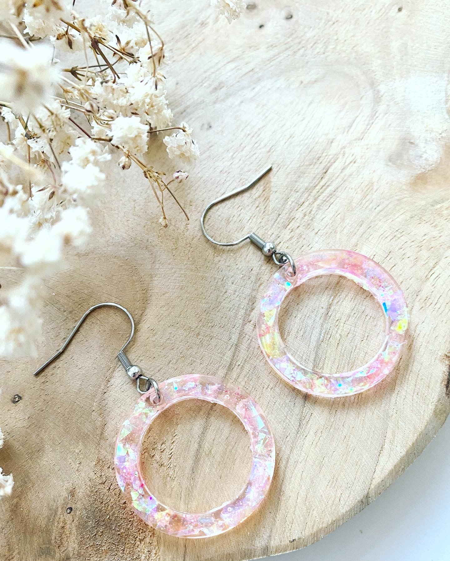 Třpytivá růžová kolekce.Náušnice visací kruhy s růžovými glitry.Velikost: 2,9 cm.Háčky: chirurgická ocel.